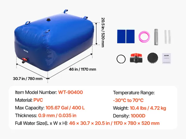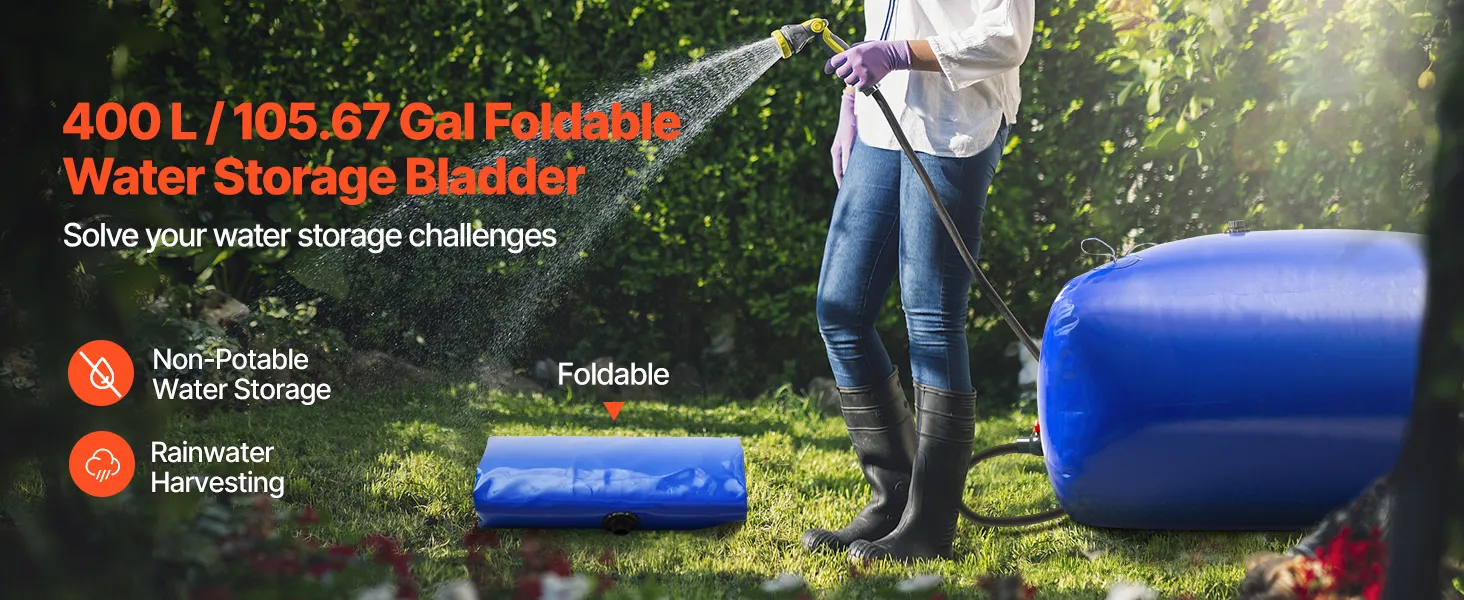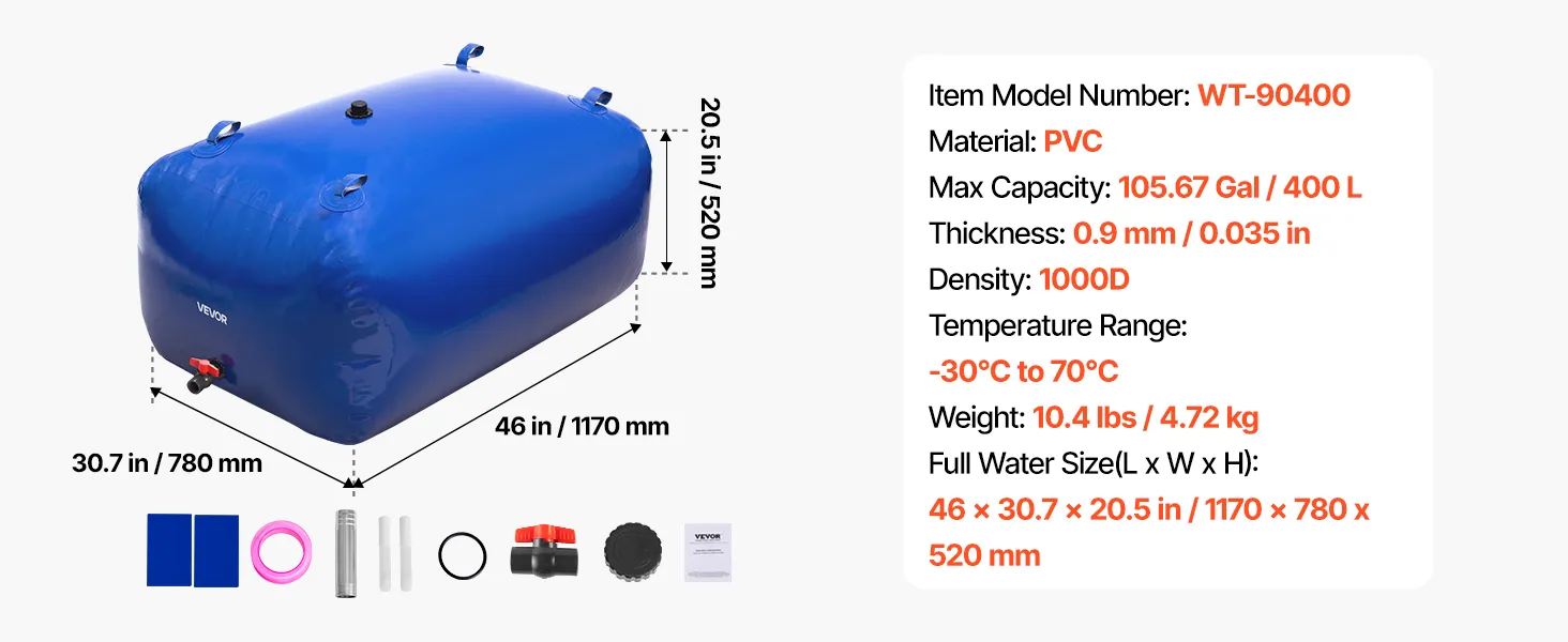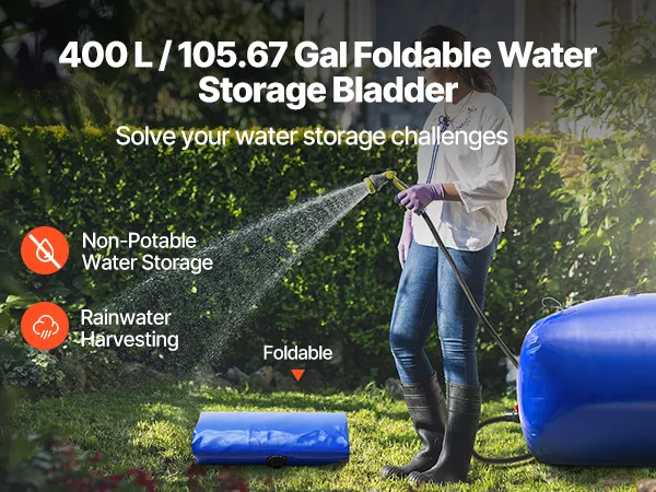 This VEVOR 105.7 Gallon/400L collapsible water storage bladder is crafted from tough 1000D double-layer PVC material, providing superior durability. Its strong sealing and leak-proof construction ensures reliable water storage for outdoor adventures, home use, gardening, or emergencies.