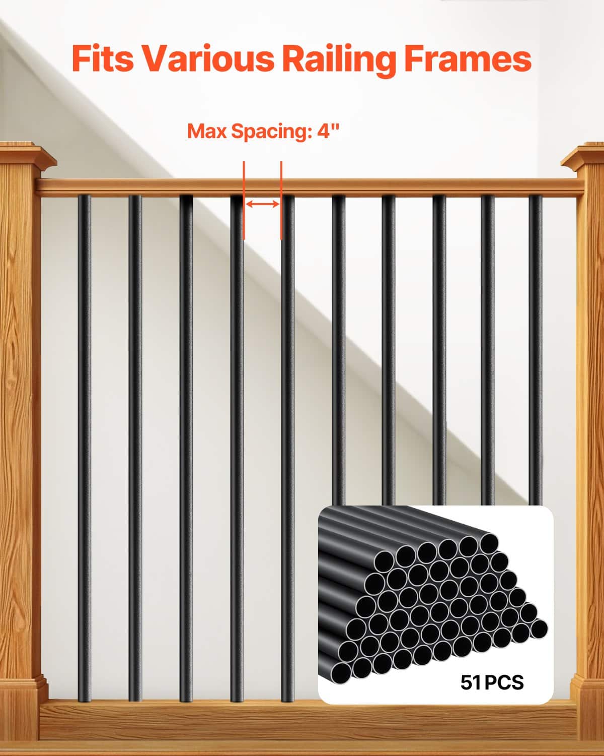 VEVOR Staircase Balusters 51 Pack, 32 In Aluminum Stair Balusters, 3/4 Inch Water-Proof Round Metal Spindle Railing, Hollow Deck Railing with Rail Caps & Screws for Stairs, Porch, Patio, Matte Black