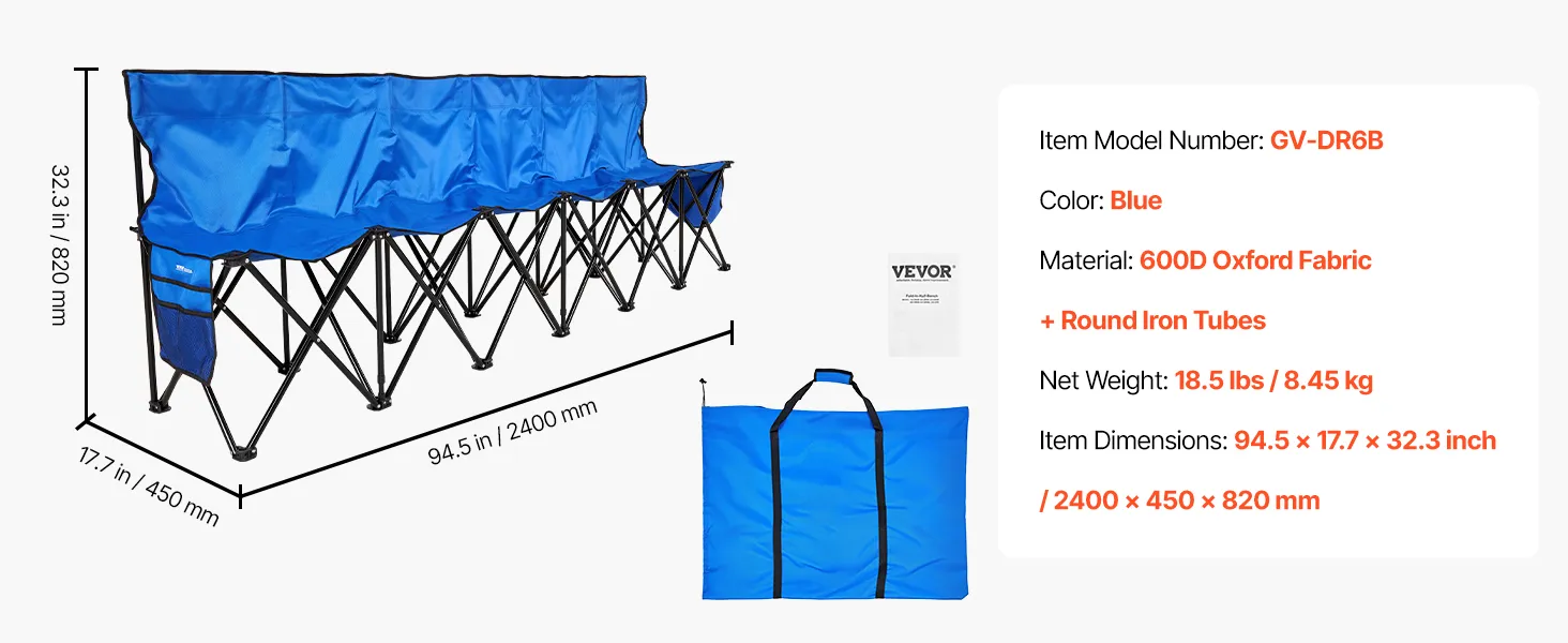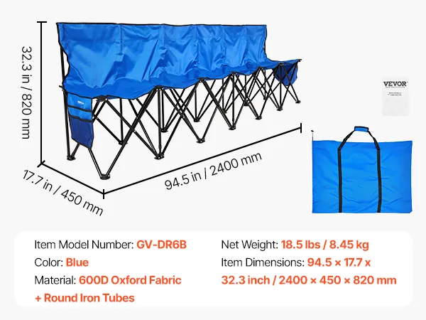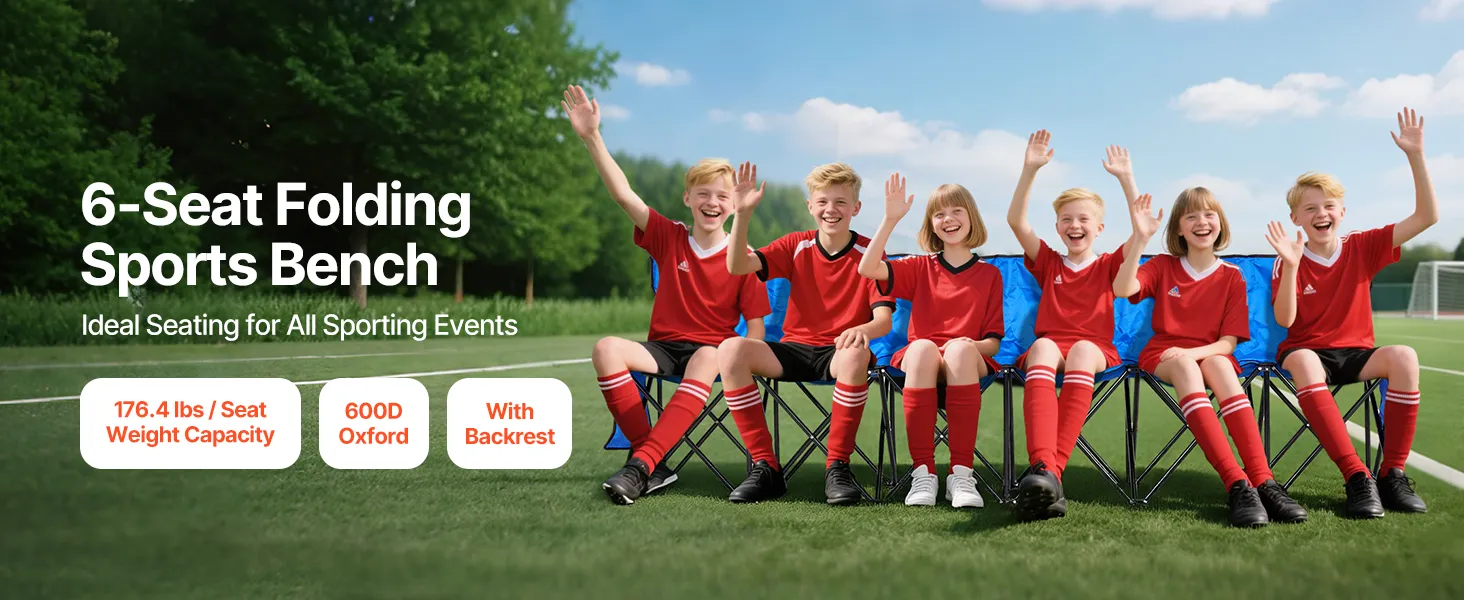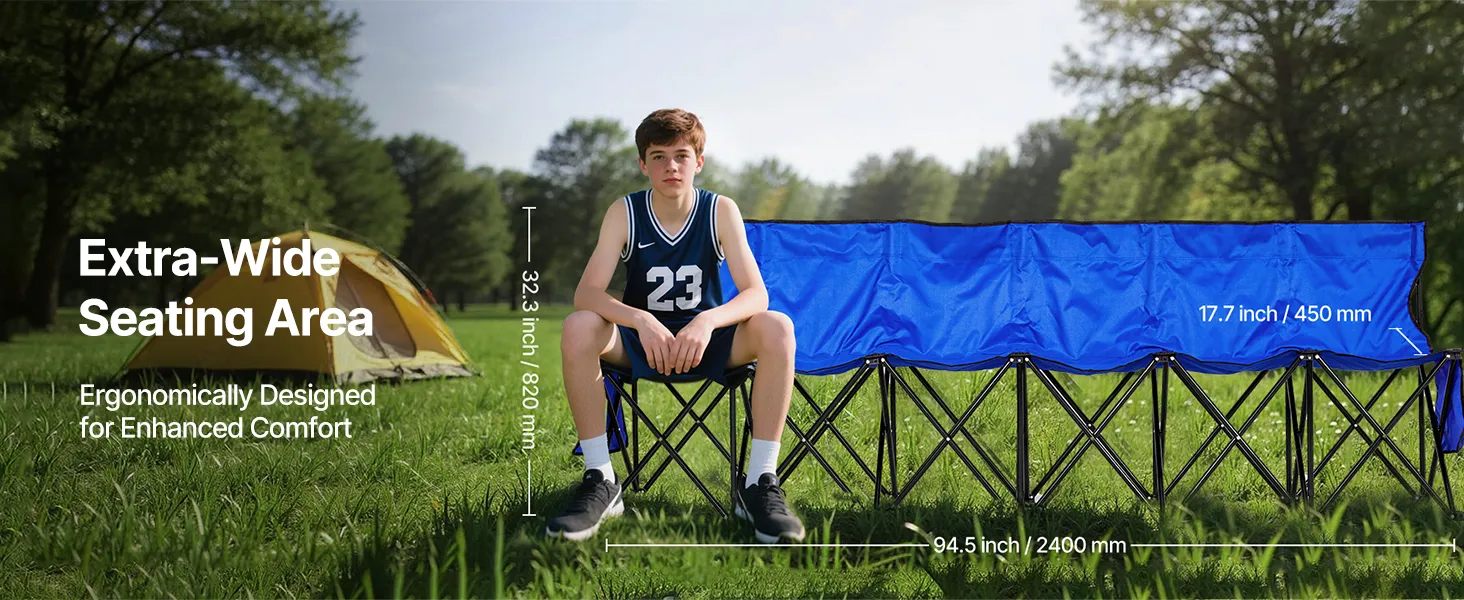 VEVOR 6-kohaline kokkupandav spordipink seljatoe, küljetaskute ja kotiga – Välimängude iste, 240x45x82 cm, sinine