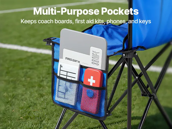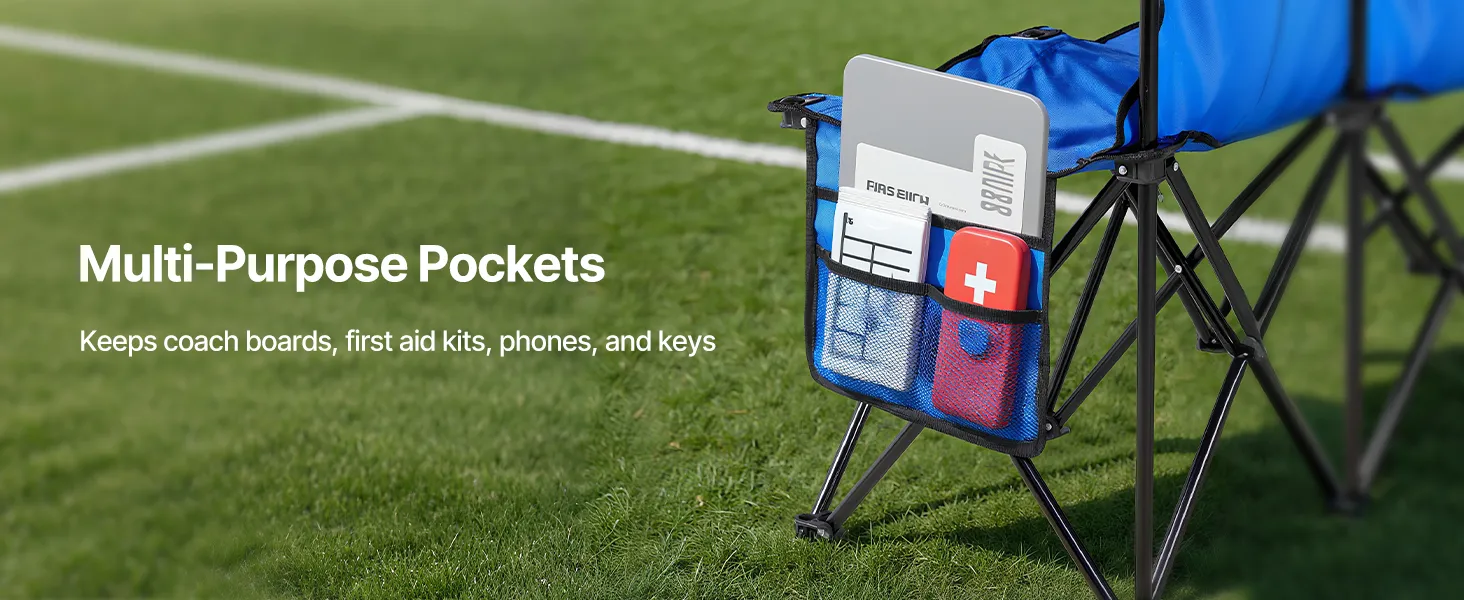 • User-Friendly Design: Side pockets are provided on both sides of the soccer bench, ideal for storing items such as a coach board, first aid kit, phone, and keys, offering thoughtful storage space