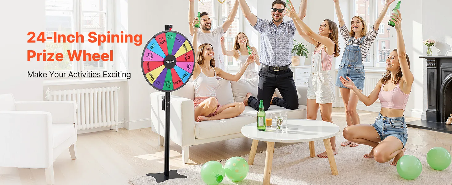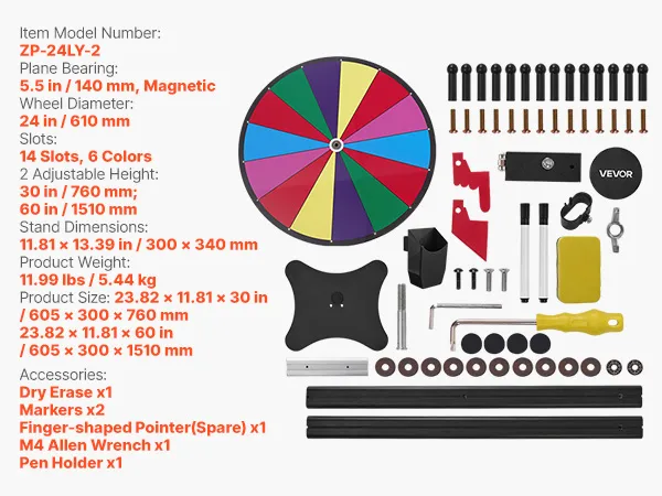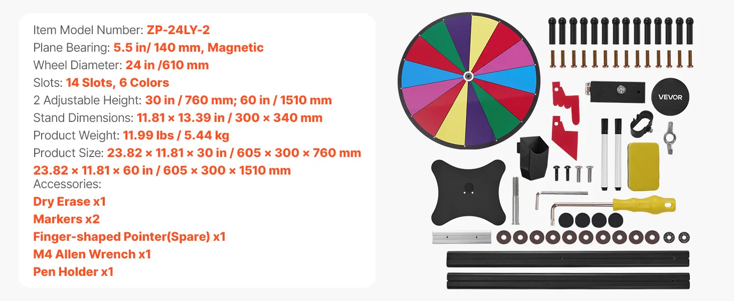 VEVOR 610 mm Spinning Prize Wheel, 14 Slots Spinning Wheel with Stand, Adjustable Height Win Fortune Roulette with a Dry Erase and 2 Markers, 6 Colors, Easy Assembly, for Party Pub Trade Show Carnival