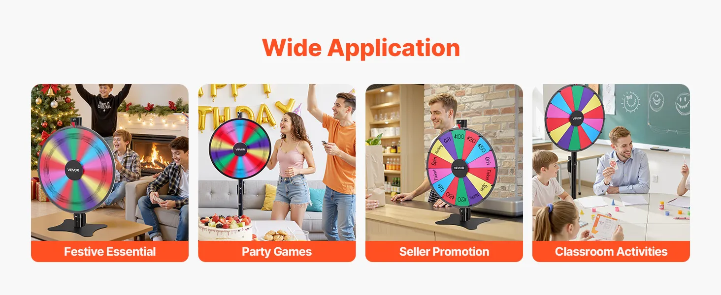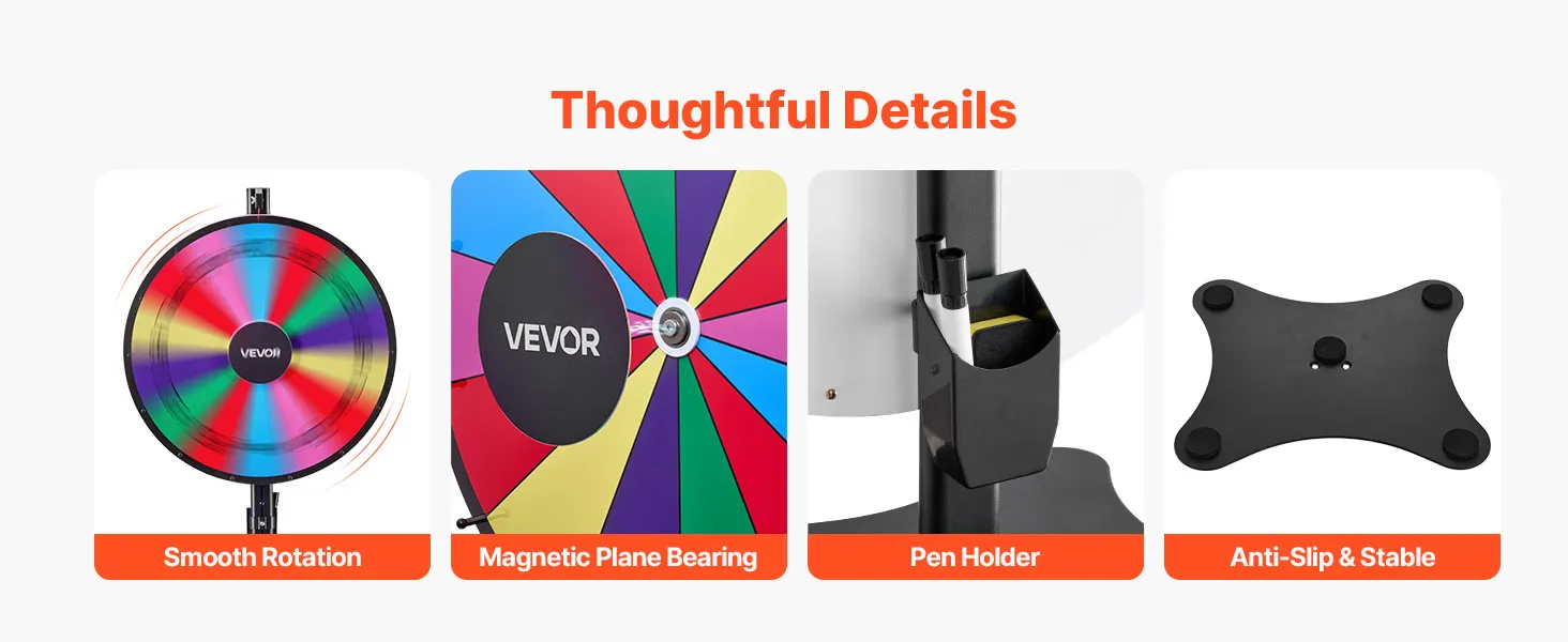 Smooth spinning with precise bearing and a non-slip base ensures stable and secure use. The spinning prize wheel comes with a pen holder for easy storage.