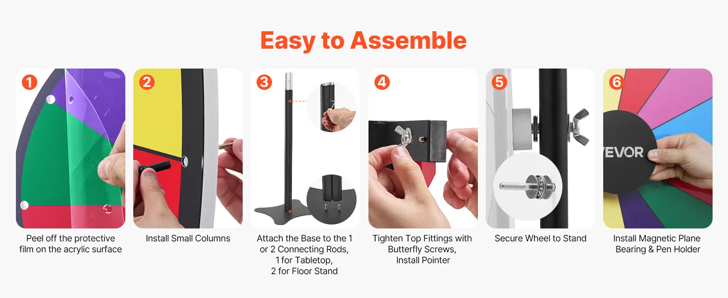 Follow the simple step-by-step instructions to assemble your wheel spinner quickly and effortlessly. All necessary parts are included, no extra tools required.