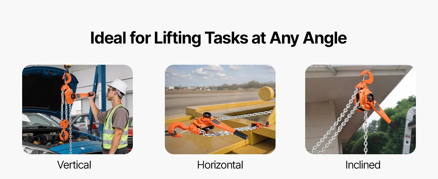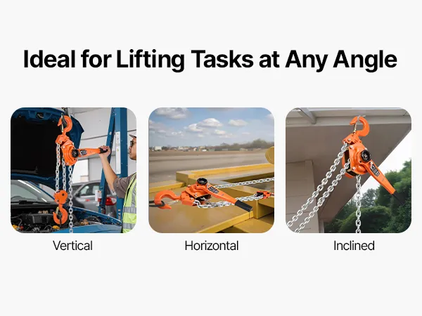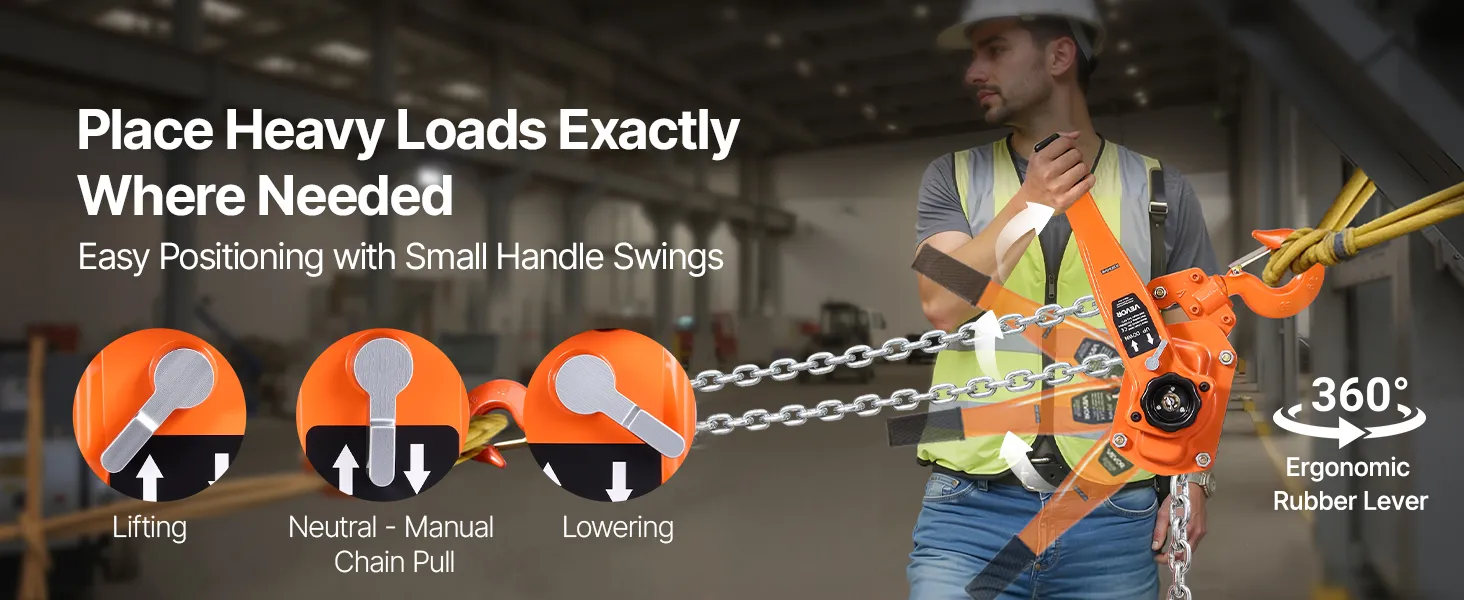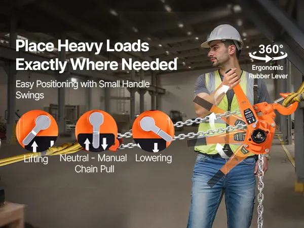 • Easy Operation: Our lever chain hoist includes a 360° rotating ergonomic handle with non-slip grip. Heavy loads can be shifted with minimal effort, for confined work areas. A three-position selector can switch between lifting, neutral, and lowering modes