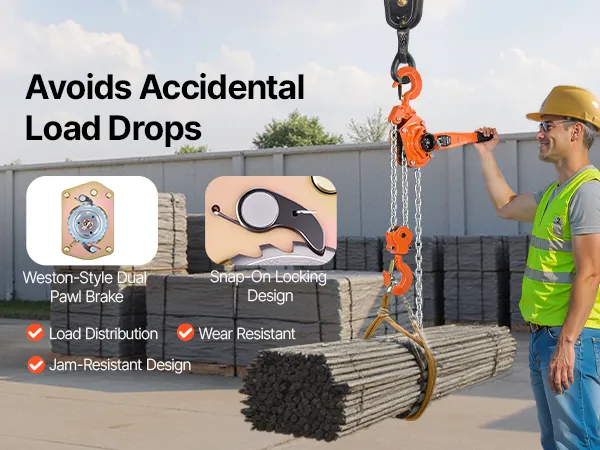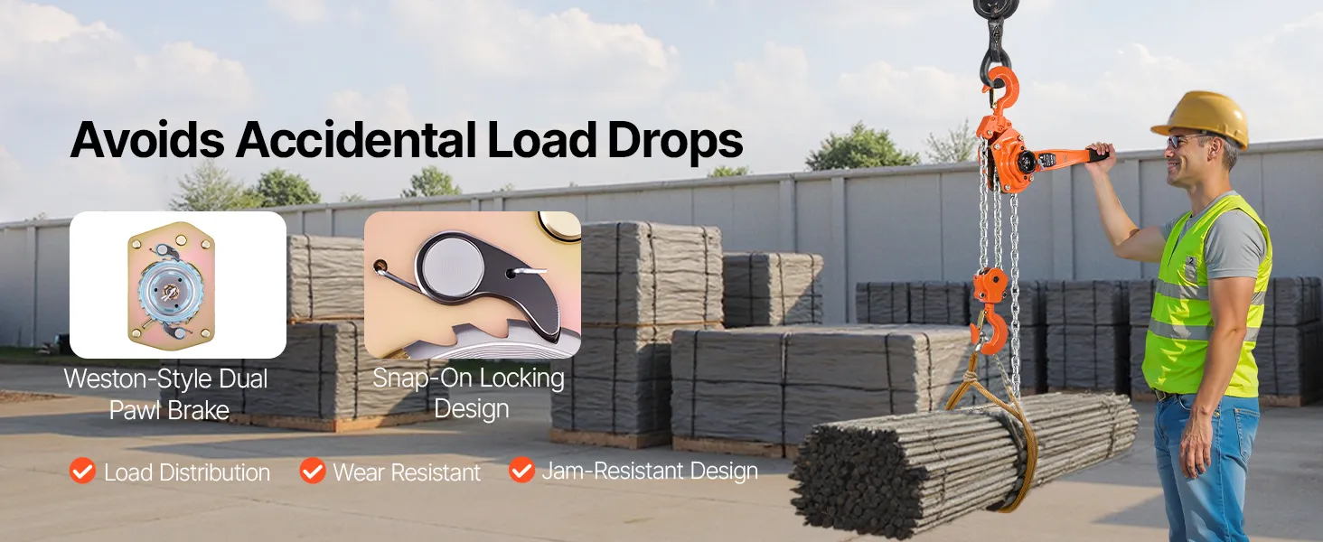 • Secure and Reliable Braking: This manual chain hoist features Weston dual pawl brake engaged with gears for precise control. Strong build avoids slipping and sudden drops, evenly spreads pressure, boosting security and extending service life