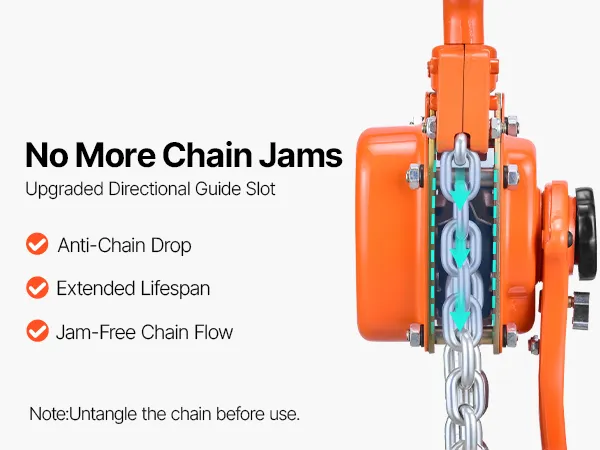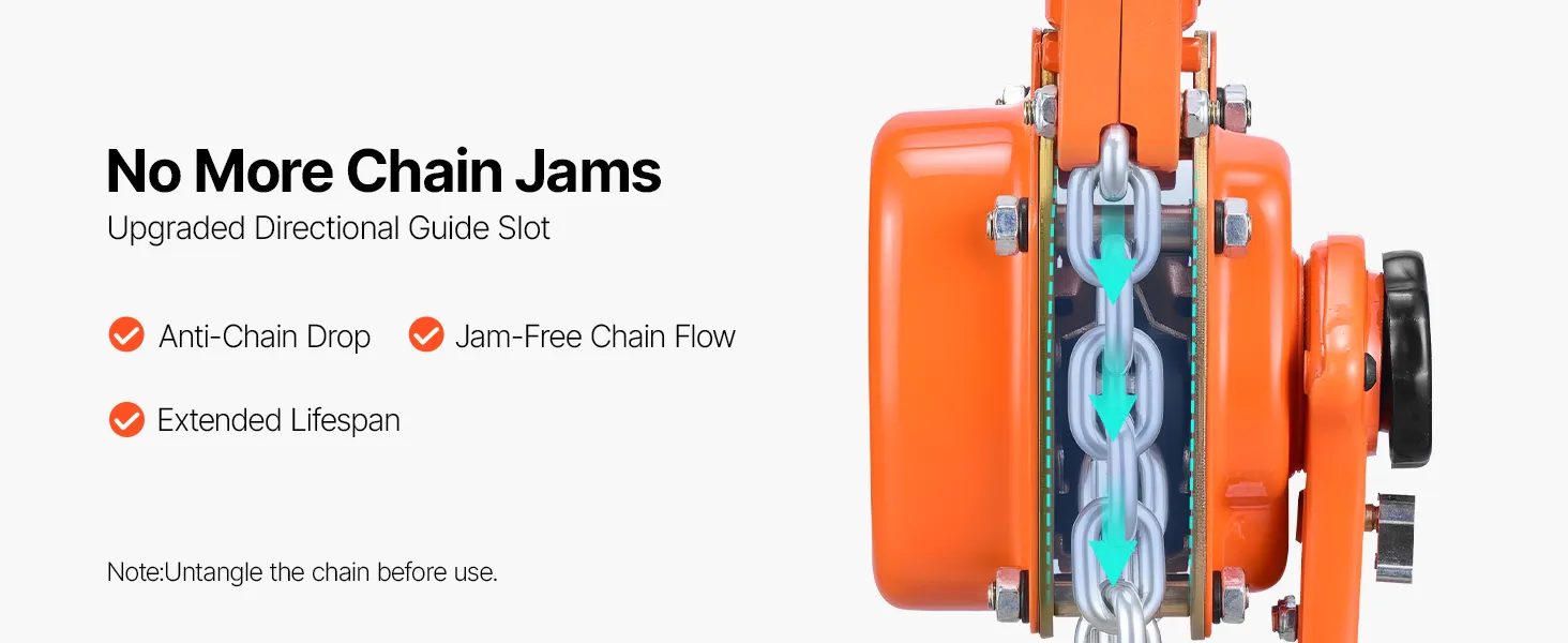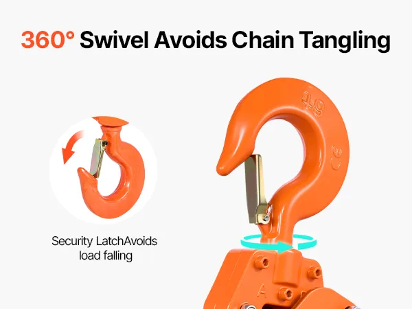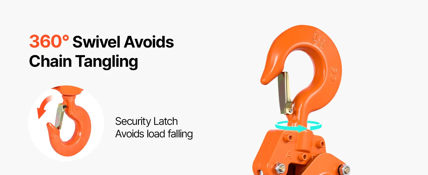 • Smooth Operation: This chain fall hoist includes an upgraded guided slot for smooth lifting without jamming. 360° swivel hook allows secure multi-angle use, avoiding twisting and increasing efficiency for tough lifting applications