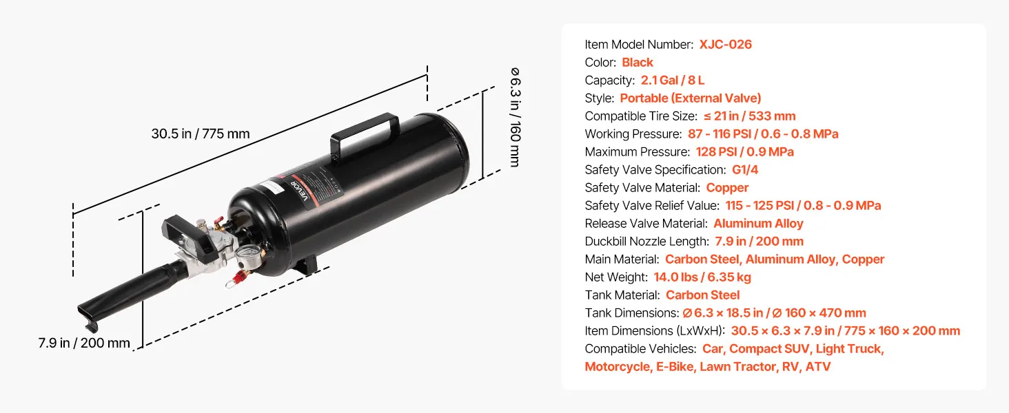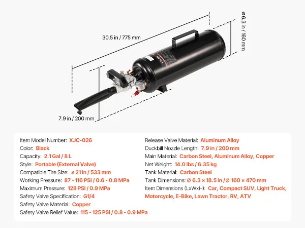 2.1 Gal / 8 L tire bead seater rapidly releases high-pressure air, seating the tire bead in the correct position in just 1 second, making tire bead sealing effortless and labor-saving.