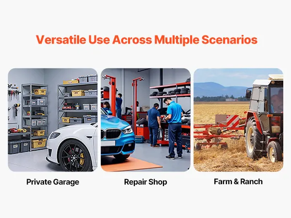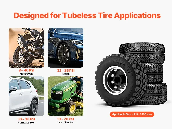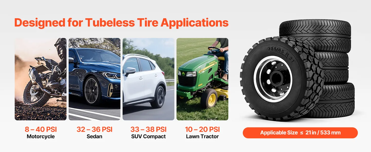 Supports tubeless tires ≤ 21 in / 533 mm, including cars, compact SUVs, small trucks, motorcycles, e-bikes, ATVs, and lawn mowers. Operating pressure: 87–116 PSI / 0.6–0.8 MPa. Adjust inflation according to tire size.