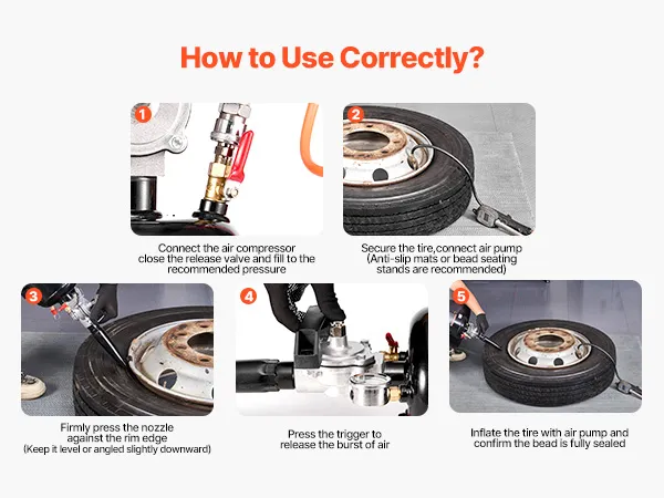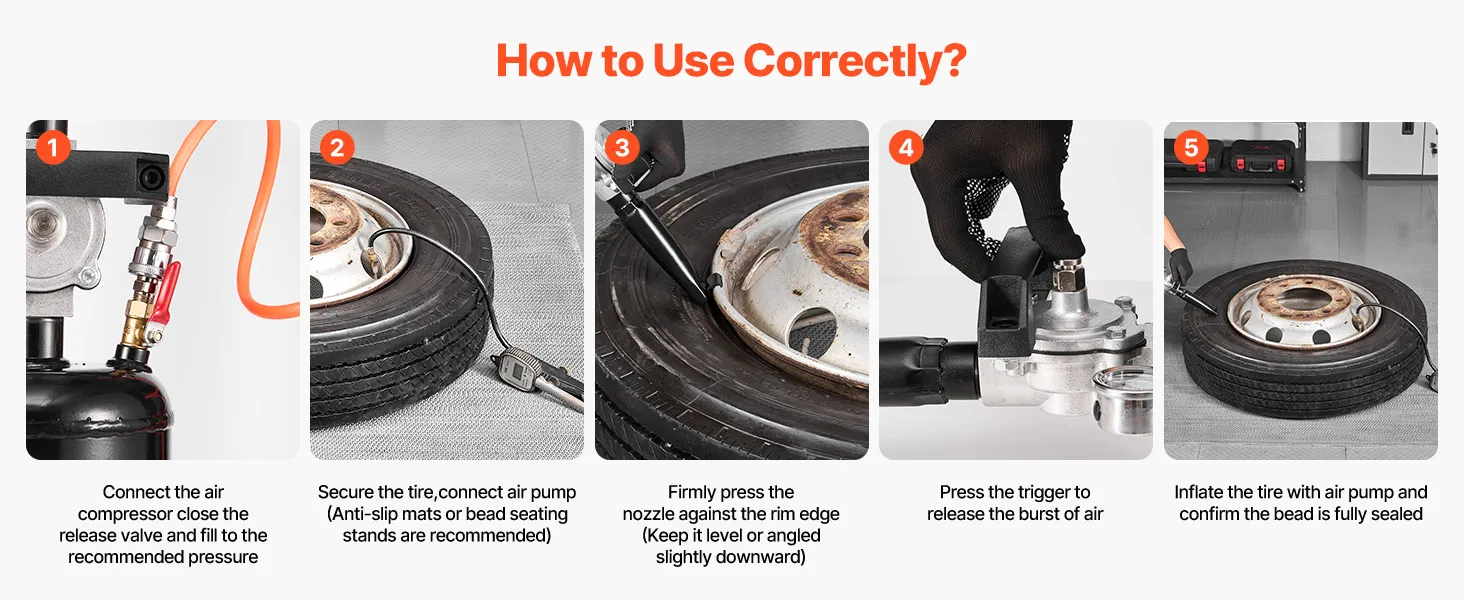 Fill the cylinder with an air compressor to working pressure. Place the tire horizontally and stable, press the nozzle against the rim edge, and trigger the exhaust. Use a non-slip mat for small tires or a bead-seating platform for large tires.
