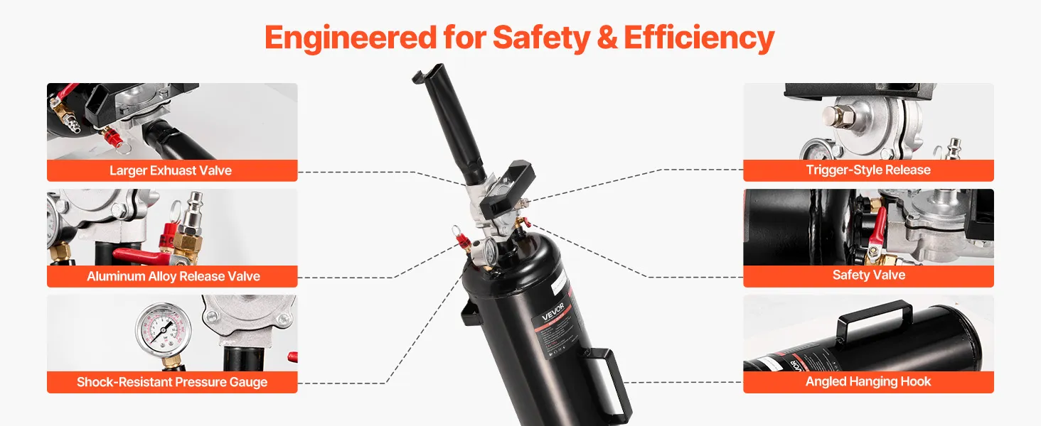 Our bead seater blaster improves bead-seating success rate with larger diameter and faster exhaust. Hose ends with flanges ensure proper rim-to-tire angle. Dual-nozzle hoses enhance airflow coverage. Equipped with a shock-resistant pressure gauge for precise readings.