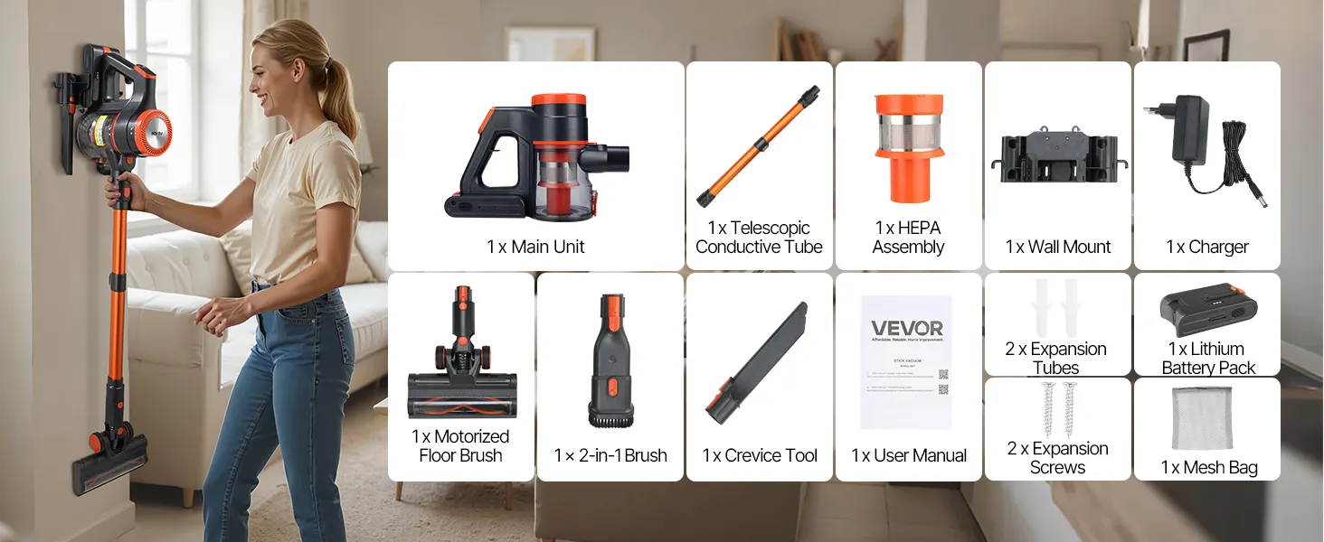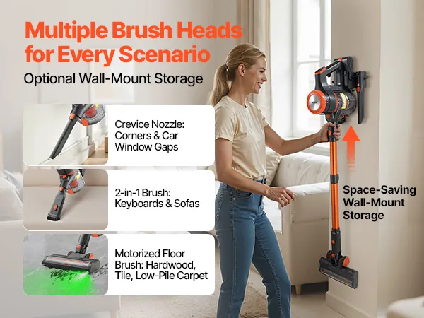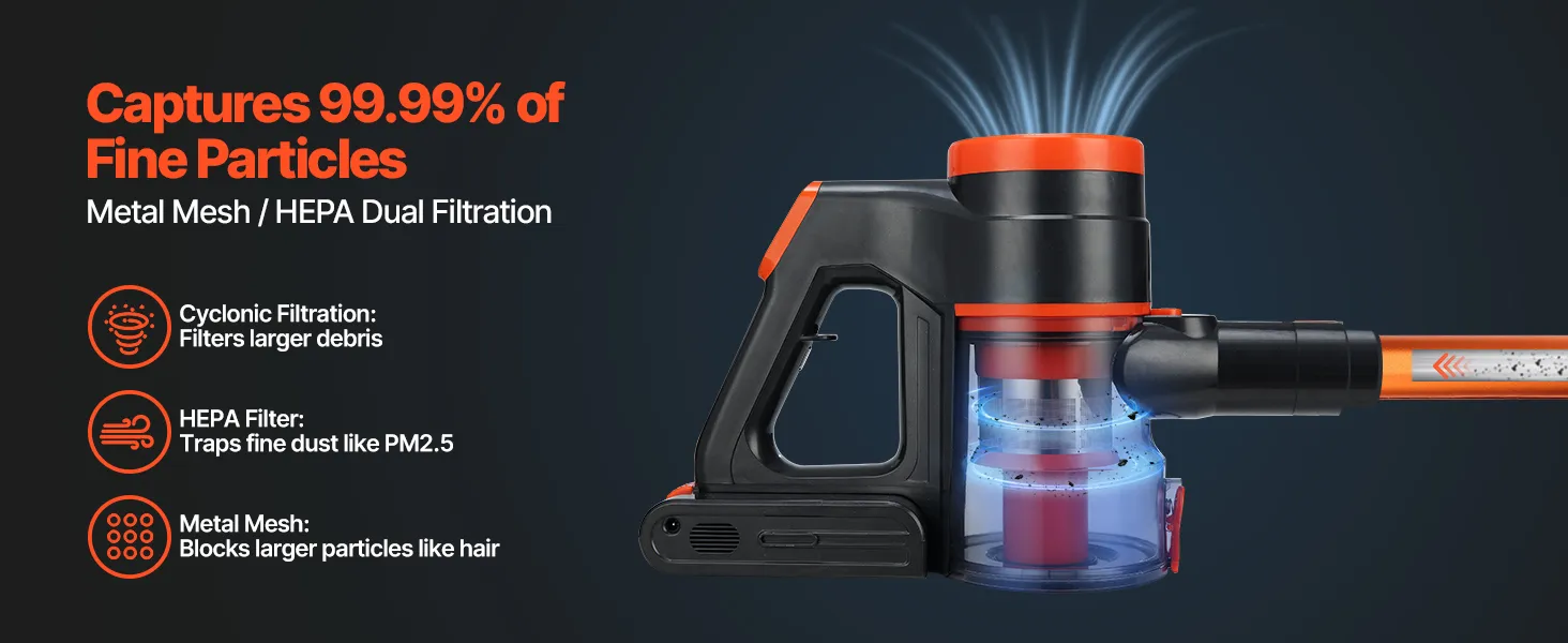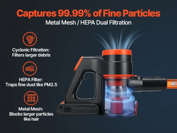• Dual Filtration for Efficient Purification: Our stick vacuum combines a metal mesh pre-filter and a high-density HEPA filter to capture hair and large debris while protecting and extending the HEPA filter’s lifespan. The washable metal filter is reusable, reducing maintenance costs