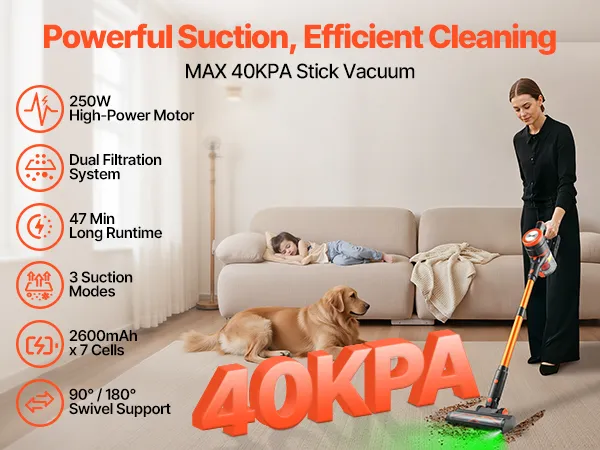 • Up to 47 Minutes Runtime: This cordless stick vacuum is powered by a 7-cell 2600mAh lithium battery that is detachable and replaceable. It delivers up to 47 minutes of runtime on low suction with about 5 hours of charging time, meeting your daily cleaning needs
