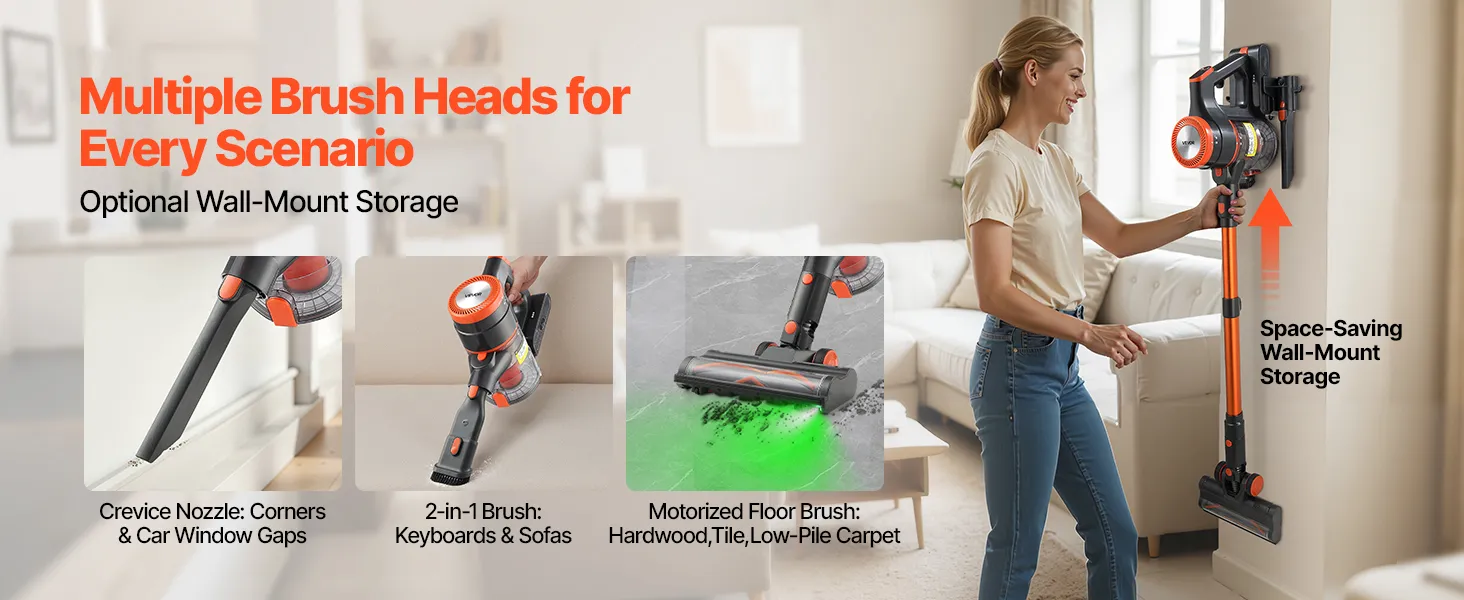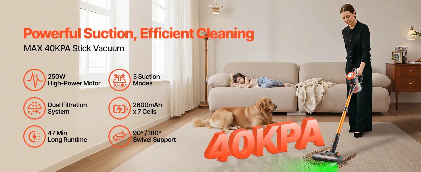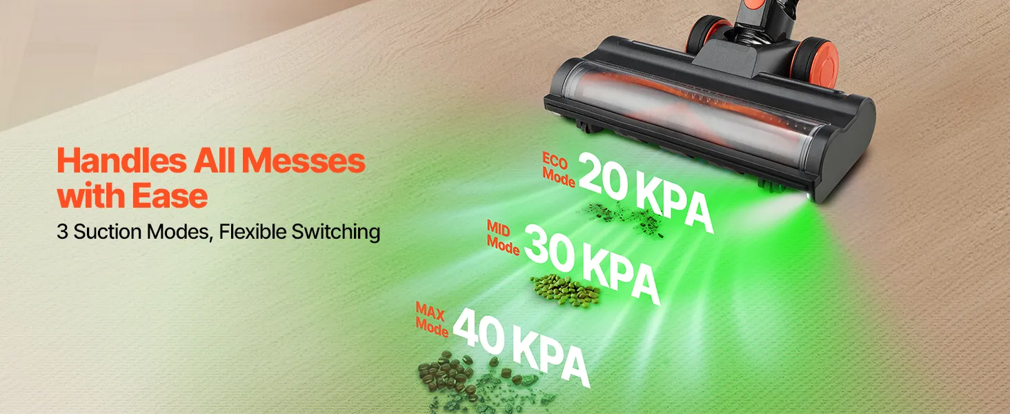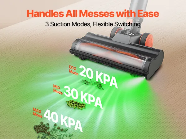 • 24KPA Suction & Powerful Motor: This cordless vacuum cleaner is equipped with a strong motor offering 3 modes—up to 40 KPA suction in max mode, 30 KPA in middle mode, and 15 KPA in low mode. It easily captures large debris, pet hair, and dust on carpets, hardwood, and tiles, solving daily cleaning needs efficiently
