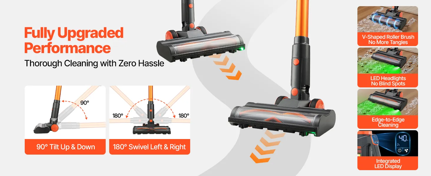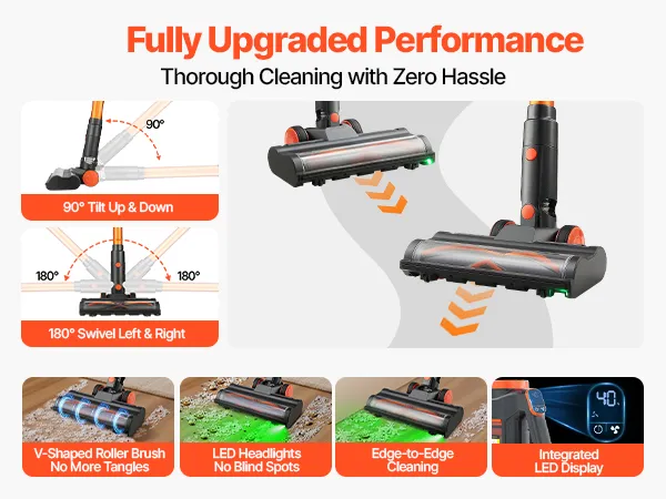 • Versatile Cleaning Performance: The flexible floor brush rotates 180° left/right and 90° up/down, making it easy to clean under furniture and in hard-to-reach corners without moving them. Multiple brush attachments are included, and bright LED lights illuminate dark areas for thorough cleaning