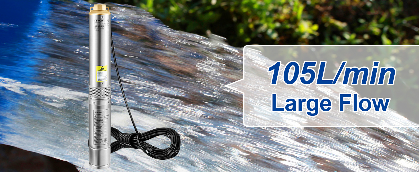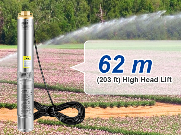 VEVOR Deep Well Submersible Pump, 750W 230V/50Hz, 105L/min 62 m Head, 20 m Cord & Automatic Pressure Switch, 8.9 cm Stainless Steel Water Pumps for Industrial, Irrigation & Home Use, IP68 Waterproof