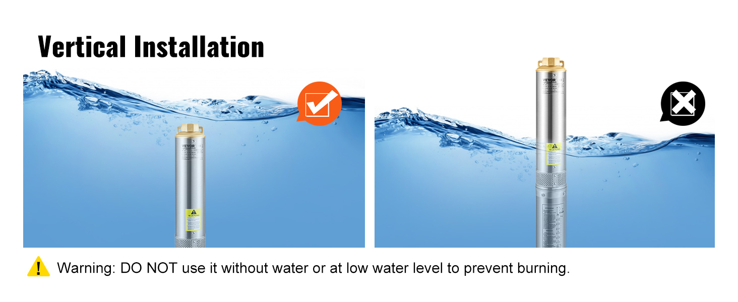 Teil on võimalik paigaldada puurkaev sukeldatavad veepump vertikaalselt või horisontaalselt. Palun pange pump täiesti vee all, et vältida pikka aega tühikäigul töötab.