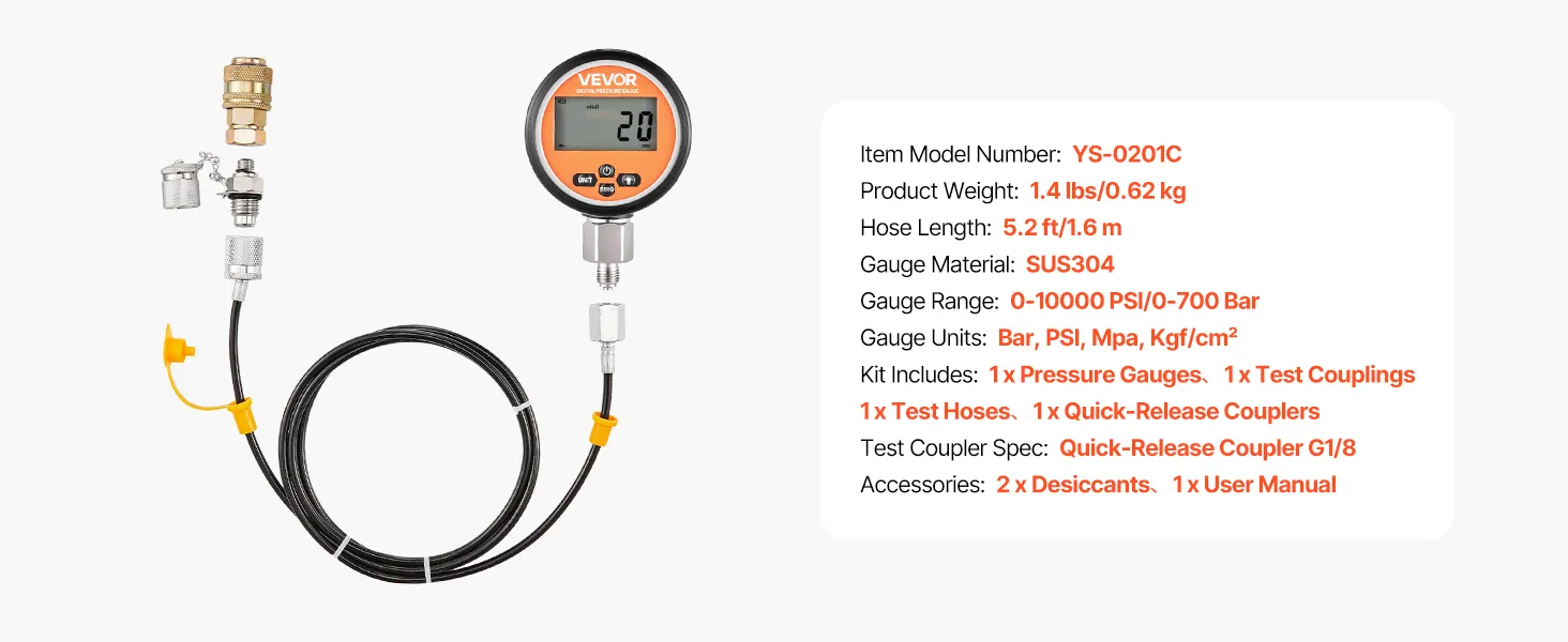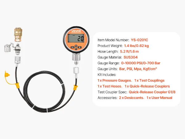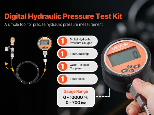 VEVOR Digital Hydraulic Pressure Test Coupling Kit, 700 Bar Pressure Gauge Manometer Tester with 1 Gauge, 1 Test Coupling, 1 Quick-Release Coupler, and 1 Hose for Excavator Construction Machinery