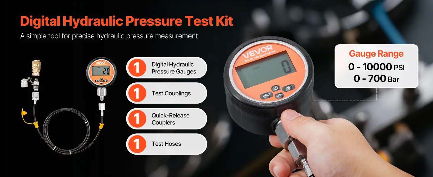 The hydraulic test gauge kit includes a high-pressure, flexible hose that supports bending and stretching. It enables testing in confined spaces or remote points, providing greater flexibility during operation.
