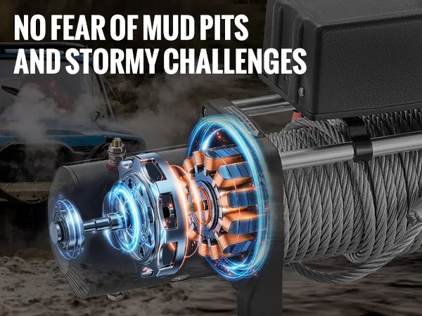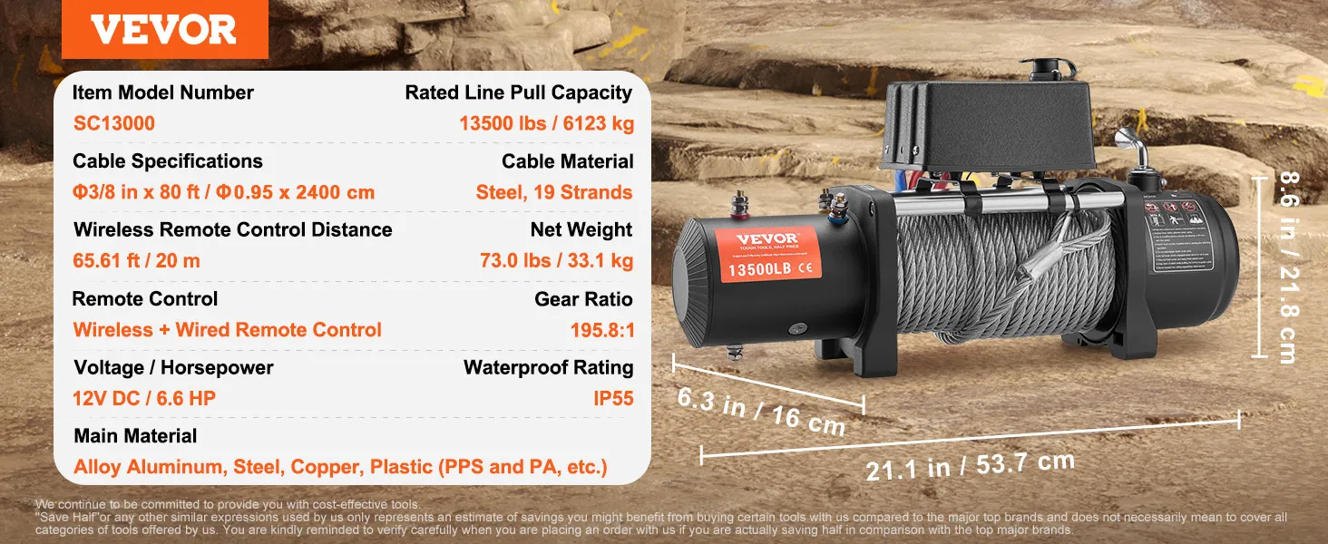 Our heavy-duty truck winch features a 13500 lbs line pull capacity and an IP55 waterproof rating, perfect for freeing your off-road vehicles or SUV from sticky mud pits or heavy rain. With a 12V DC/6.6 HP copper motor, 195.8:1 gear ratio, and steel cable, you're always prepared.