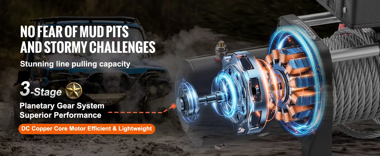 Our electric winch is powered by a robust 12V DC/6.6 HP copper motor, delivering consistent, efficient power every time. With an advanced planetary gear setup and a 195.8:1 gear ratio, you'll enjoy smooth, reliable line pull capacity even in harsh weather conditions or deep mud.