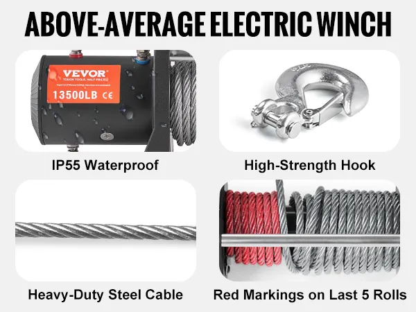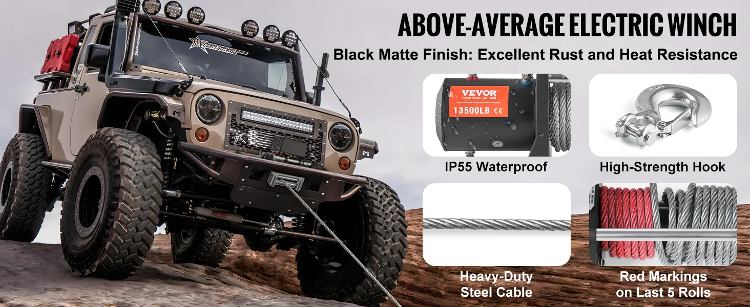 Our electric winch for truck is designed with a high-quality cable that includes red markings on the last 5 rolls for extra security. It features an IP55 waterproof rating and a rugged black matte finish, so it stands up to heavy rain and rough conditions without a hitch.