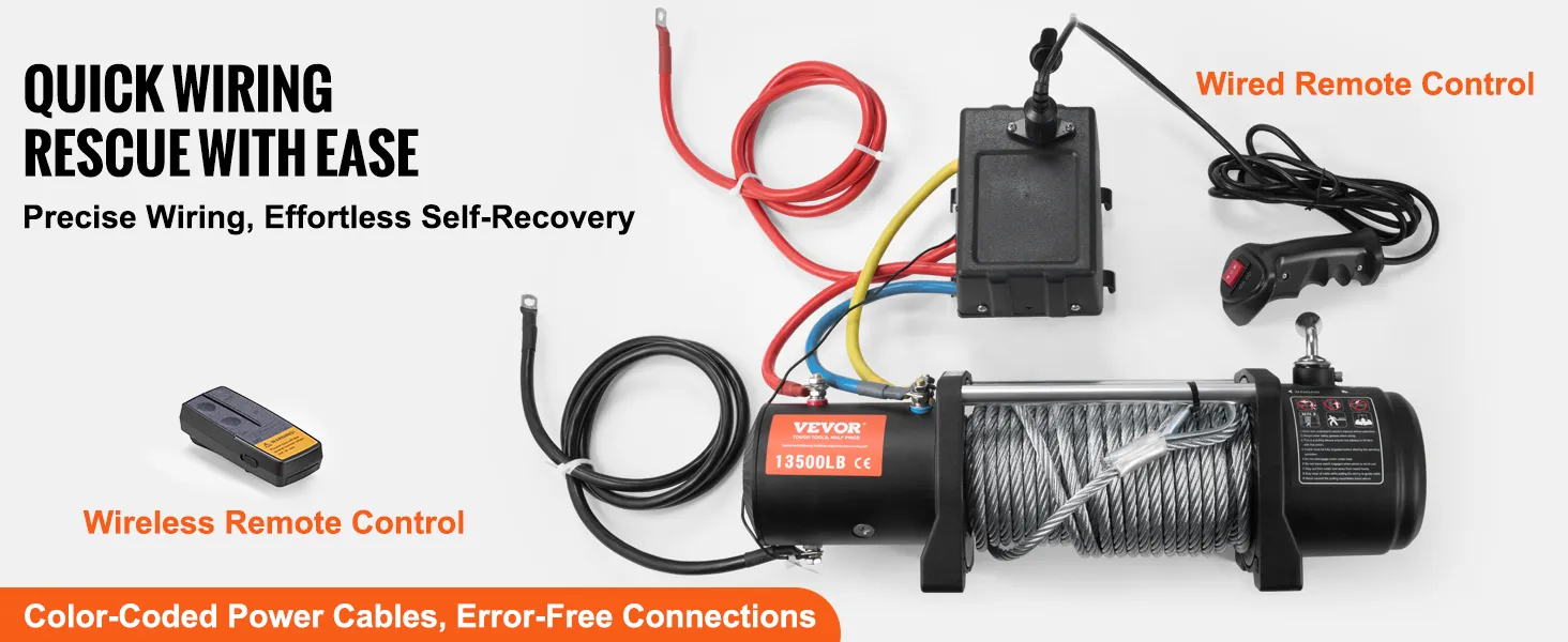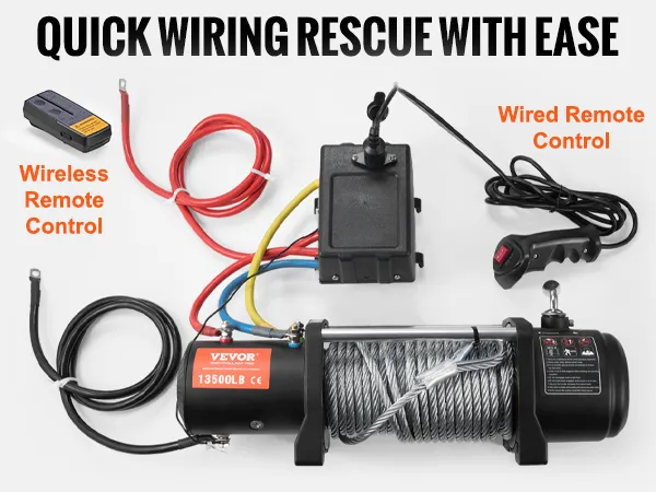 Our 12 volt winch features color-coded power cables for quick and error-free setup. The wireless remote controls help to operate the vehicle's self-rescue without obstacles within a 65.61 ft/20 m range. We've got you covered with a wired remote as well, giving you all the control you need.