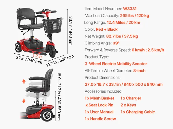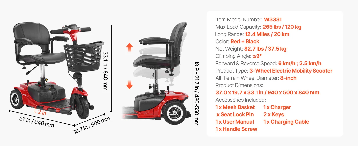 VEVOR 3-wheel folding mobility scooter supports up to 120 kg, offering reliable mobility for seniors, adults, and individuals with disabilities. The 24V 12Ah battery provides an extended range of up to 20 km per charge, delivering reliable stability and strong support for smooth mobility.