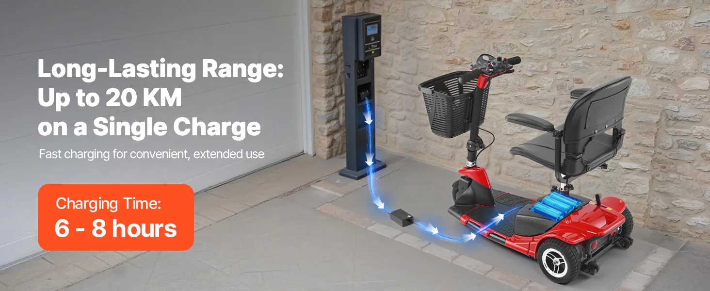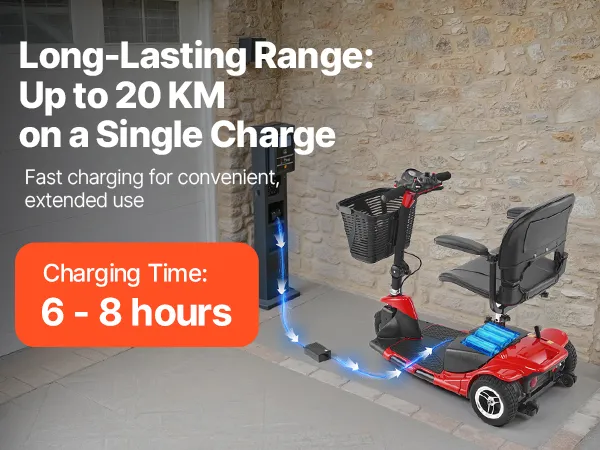 Our 3-wheel electric mobility scooter features a high-capacity 24V 12Ah battery, offering up to 20 km of travel on a single charge for reliable, long-lasting power during your outings.
