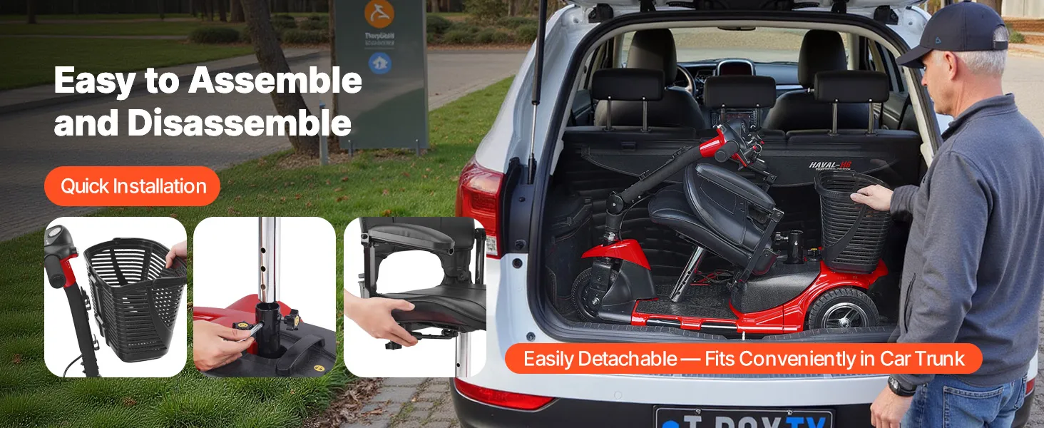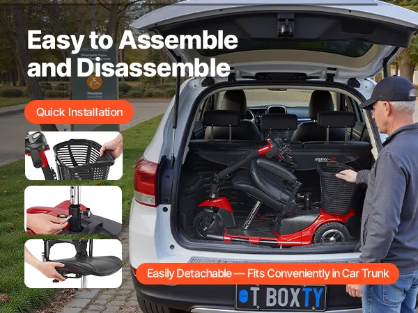 Ideal for both indoor and outdoor use, this electric powered mobility scooter offers smooth mobility and strong support. Its detachable, folding design fits easily in your car trunk, making it easy to store and transport.