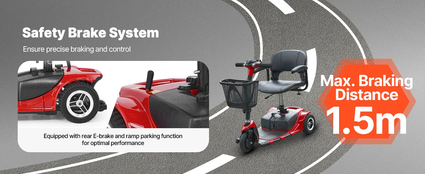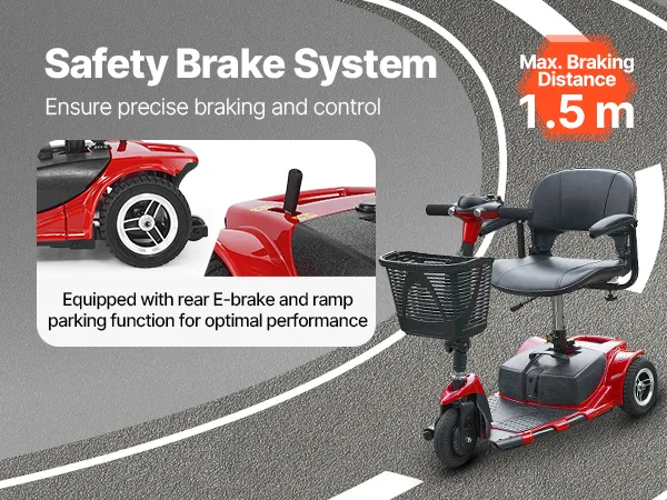 Equipped with a responsive dual braking system (rear E-brake and ramp parking function), this foldable mobile wheelchair ensures quick stopping and precise control. Max. Braking Distance: 1.5 m.