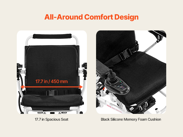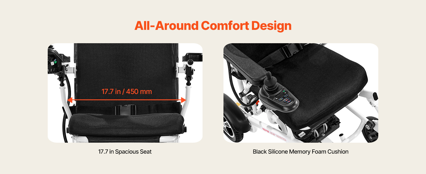 • 300lbs Kaal Mahutavus: Toetab kuni 300lbs (136kg), mille avar 17.5-tolline (45cm) istme mugavust ja stabiilsust. Vastupidav metallist raam tagab pikaajalise vastupidavuse, muutes selle elektrilise ratastooliga ideaalne igapäevaseks kasutamiseks