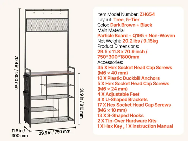 Wall-mounted anti-tip straps and adjustable feet of this coat shoe rack work together to enhance stability, helping maintain a secure and comfortable home space for the whole family.