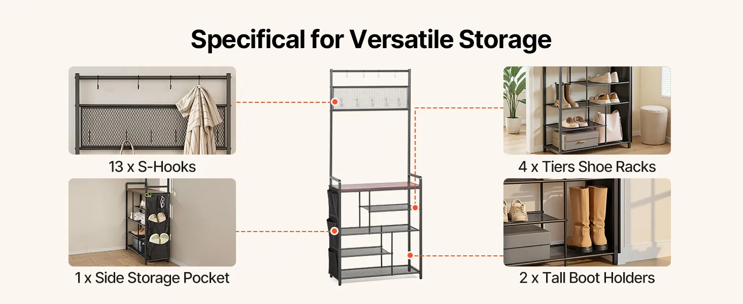 The shoe and coat rack keeps frequently used clothes, shoes, bags, and everyday items in one place for quick access, helping reduce clutter and maintain a tidy living space.