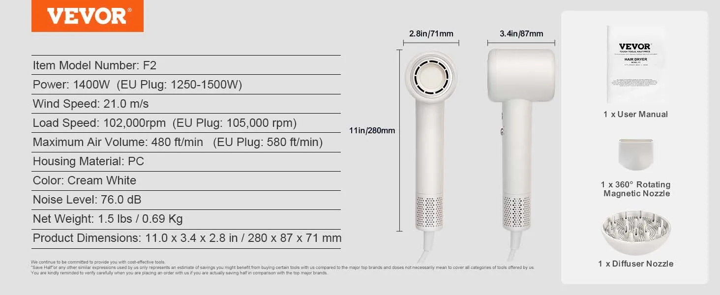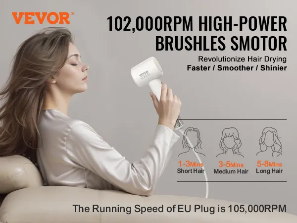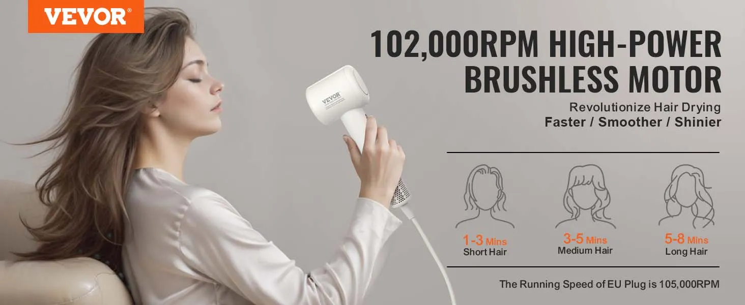 VEVOR High-Speed Hair Dryer 105000RPM 200 Million Negative Ions 3 Temp & 2 Speed