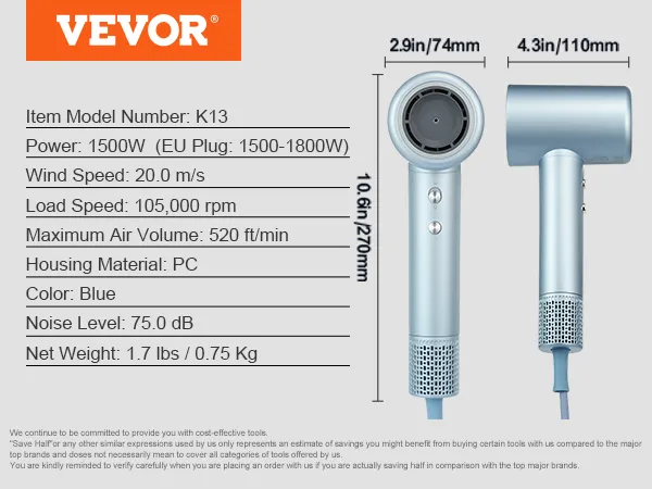 VEVOR High-Speed Hair Dryer 105000RPM 200 Million Negative Ions 4 Temp & 3 Speed