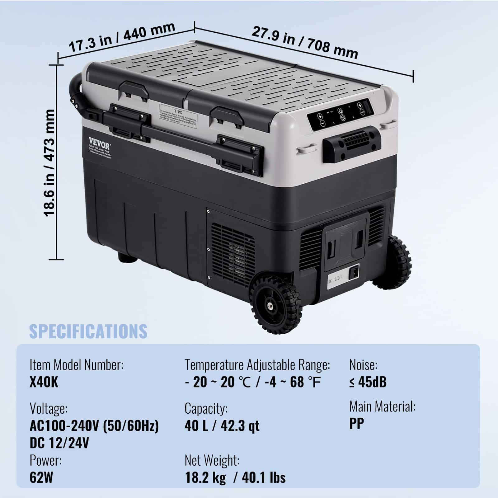 VEVOR kaasaskantav autokülmik, 12-voldine autokülmik, 40 l/42,3 qt kahetsooniline kaasaskantav sügavkülmik, -4°F-68°F reguleeritav temperatuur, kompressorijahuti kodu-, väli-, telkimis-, haagissuvila-, auto