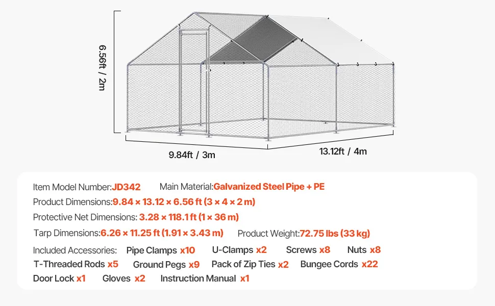 VEVOR Metal Chicken Coop, 9.8x13.1x6.5 ft Large Walk-in Chicken Runs with Cover, Spire Roof Hen House Enclosure with Security Lock, Outdoor Duck Rabbit Cage Poultry Pen for Backyard, Farm, Yard