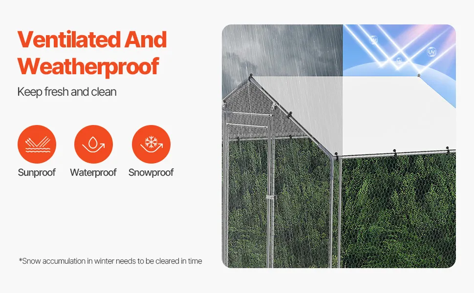 The large chicken run is designed with four-sided ventilation to reduce odors. Remember to clear snow buildup in winter for a fresh living space for your poultry.