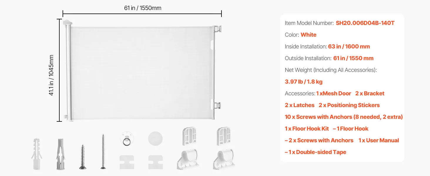 • Escape-Proof Bottom Hook: Pets and toddlers love to explore—this retractable baby gate features a reinforced bottom hook that reduces crawling through and blocks dangerous bottom gaps. It’s paired with high-strength mesh for long-lasting durability