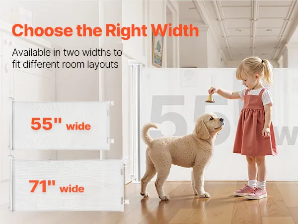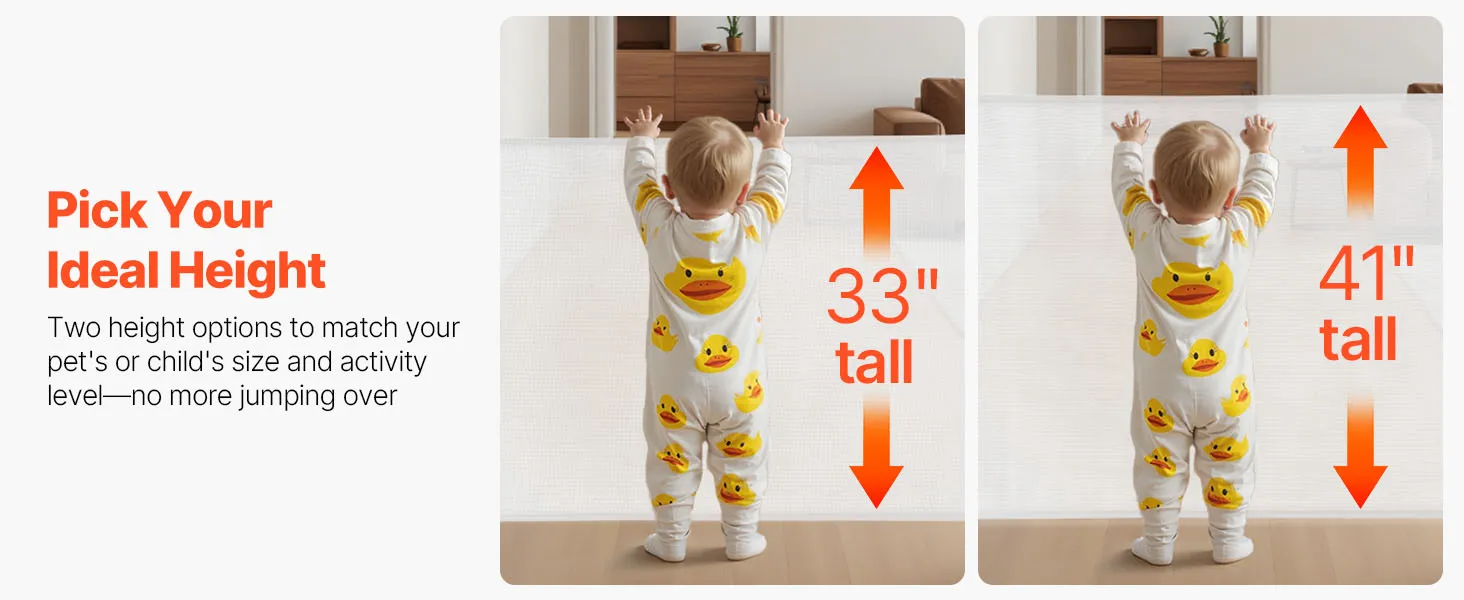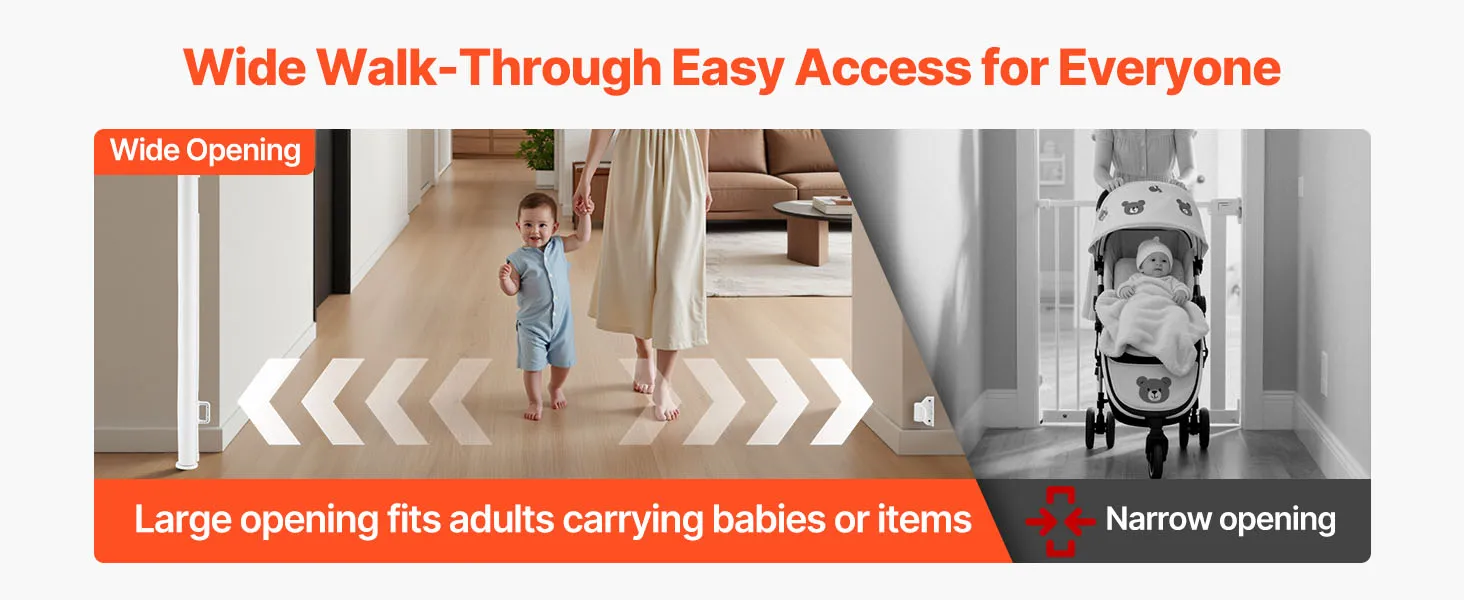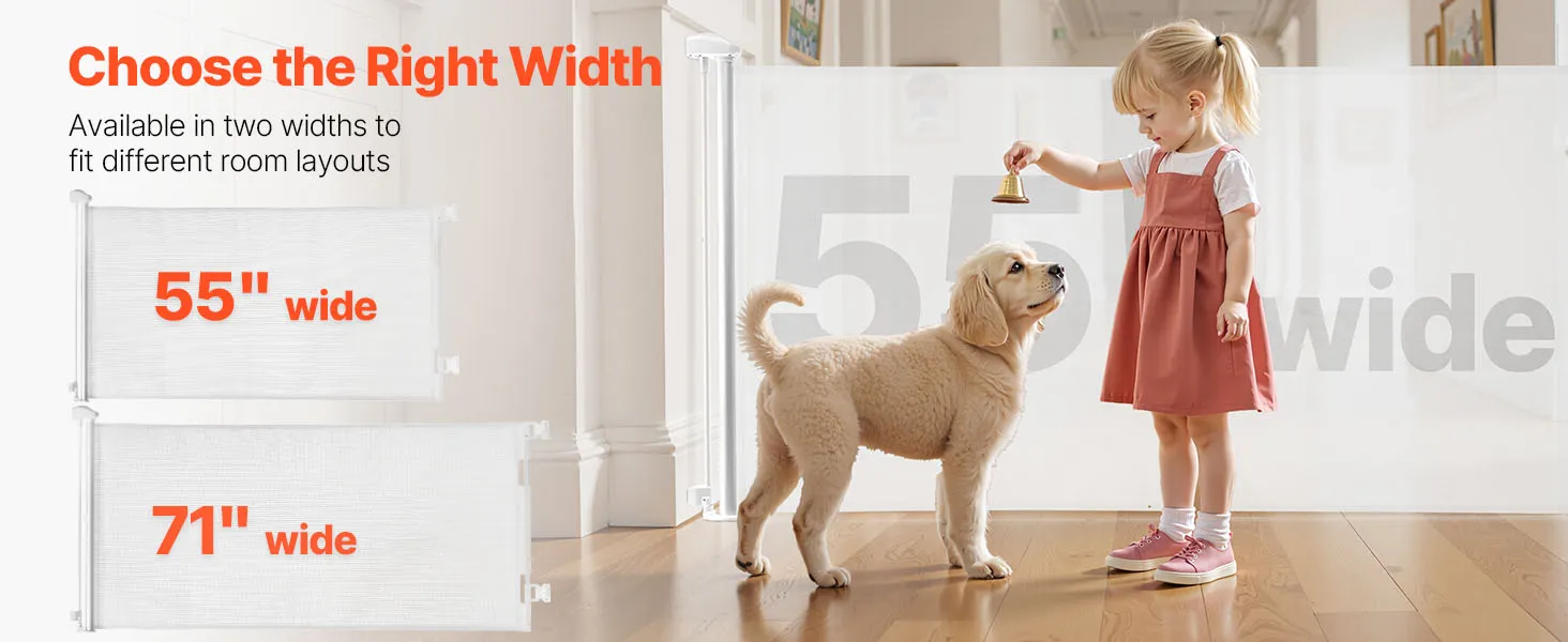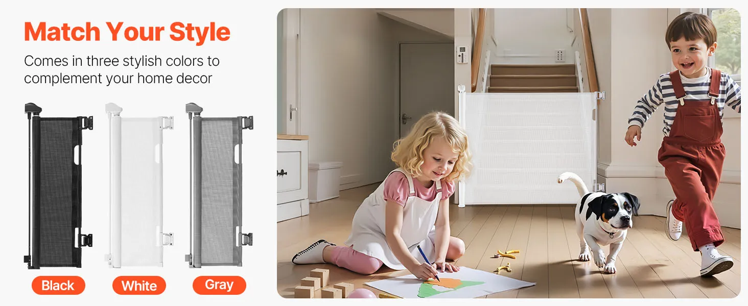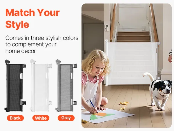 • Retractable & Clutter-Free: When retracted, the retractable pet gate disappears into its housing, keeping your space tidy and walkways fully open. Designed without a bottom threshold to reduce tripping and ensure secure daily use for kids and pets