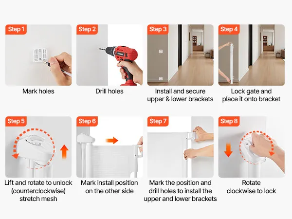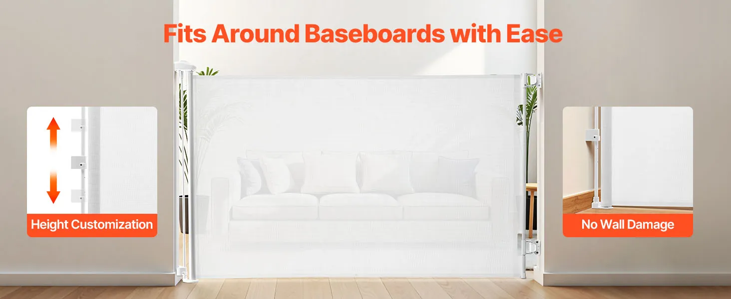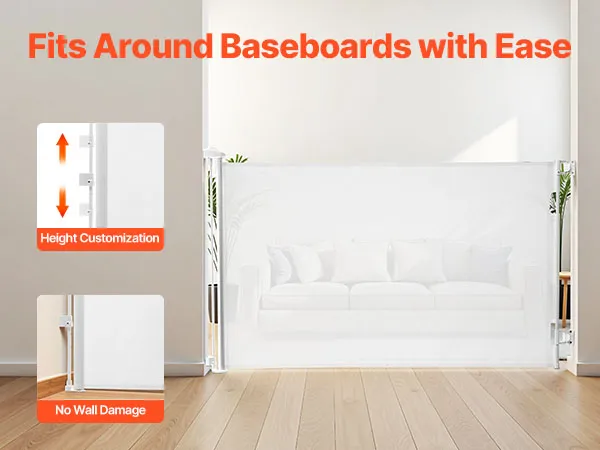 • Damage-Free Baseboard Fit: Lower brackets can be adjusted vertically, allowing the retractable dog gate to be mounted over baseboards without damage. All hardware is included for quick and easy installation