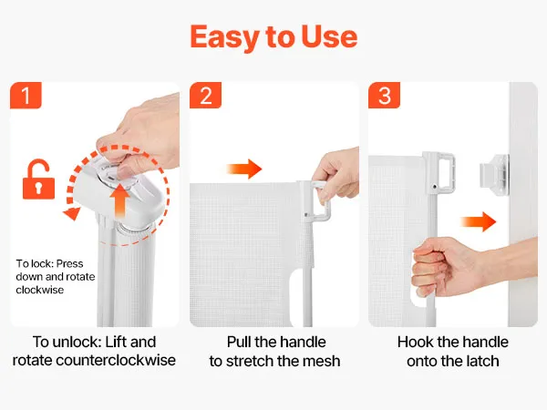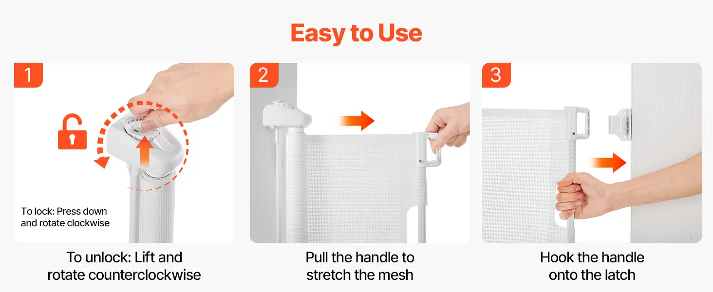 • Escape-Proof Bottom Hook: Pets and toddlers love to explore—this retractable baby gate features a reinforced bottom hook that reduces crawling through and blocks dangerous bottom gaps. It’s paired with high-strength mesh for long-lasting durability