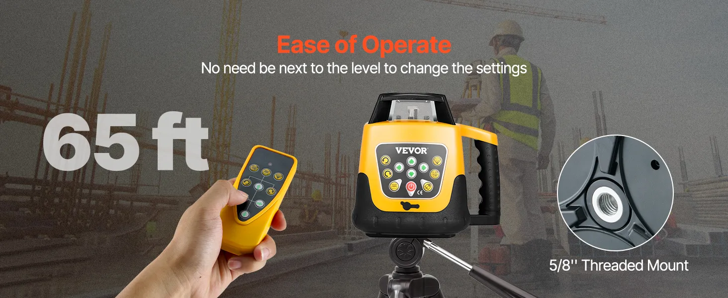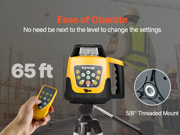 When paired with a laser detector and remote control, the maximum remote distance reaches 65 ft, supports both vertical and horizontal mounting for versatile laser level tool applications.