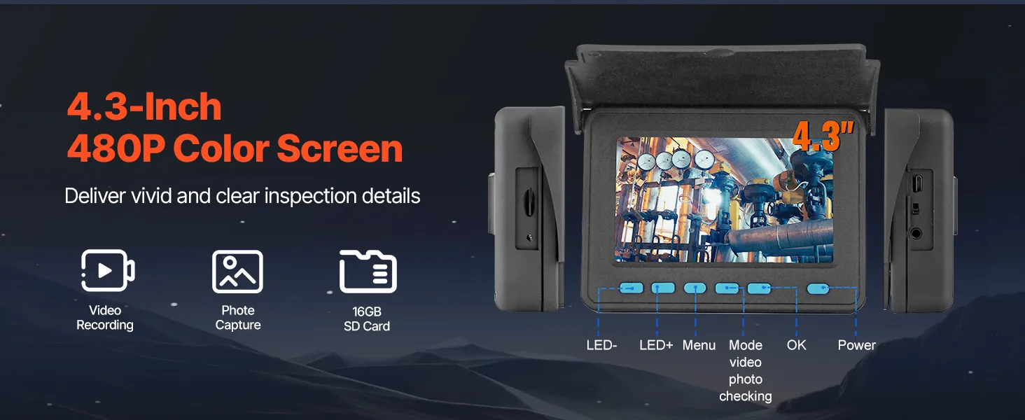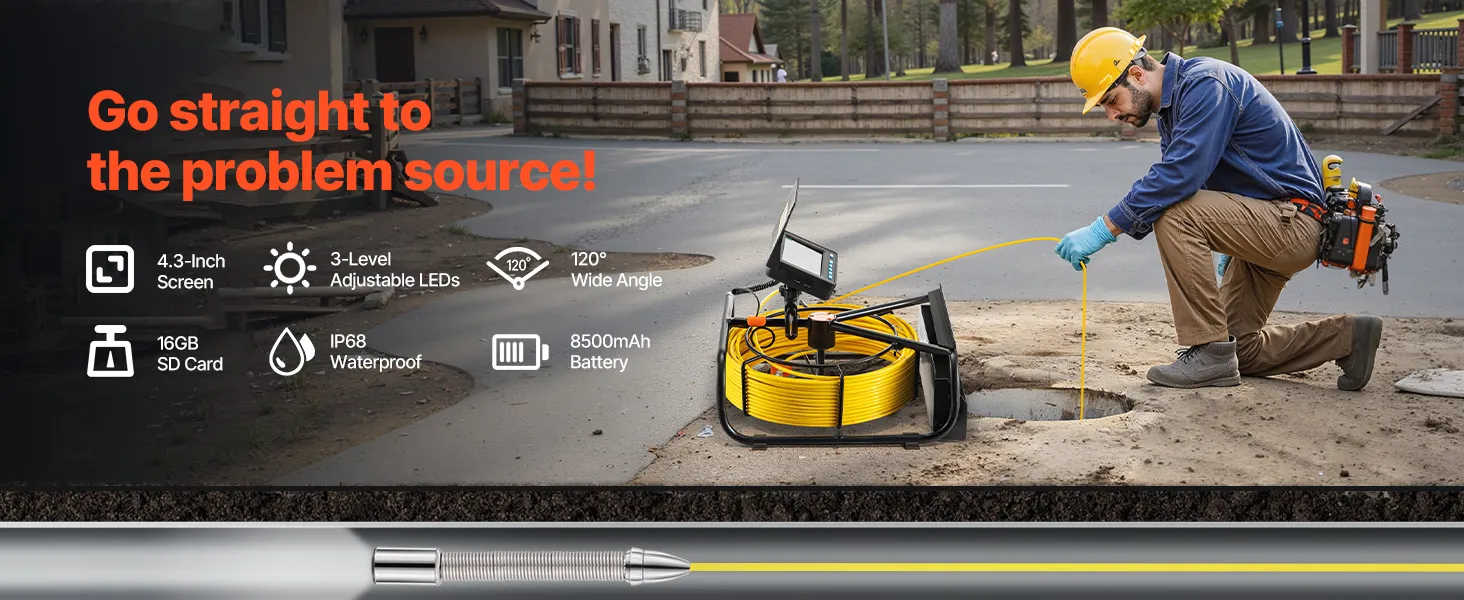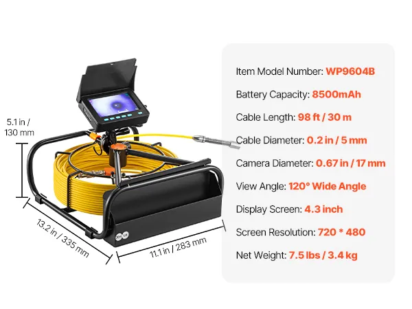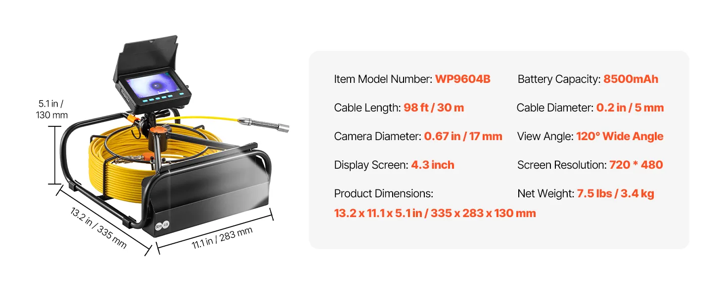 VEVOR 30m sewer camera makes pipe inspections faster and easier! Featuring 4.3-inch LCD color screen, 6PCS adjustable LEDs, 8500mAh rechargeable battery, it is the ultimate professional solution for inspecting sewers, drain pipes, and chimneys with precision.