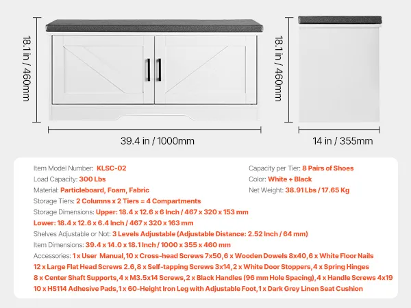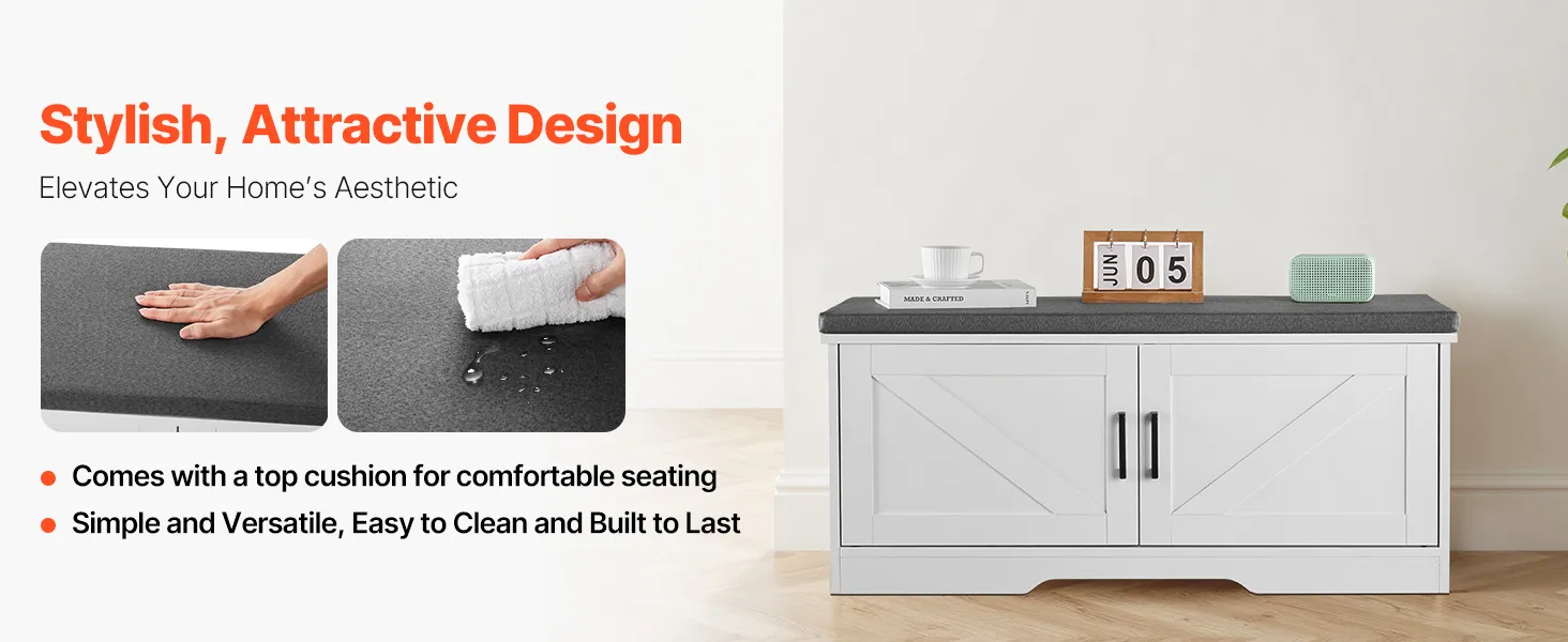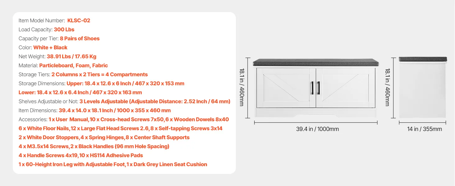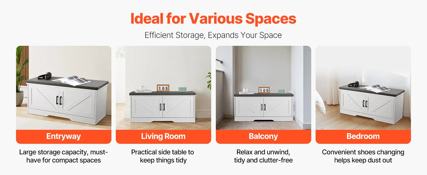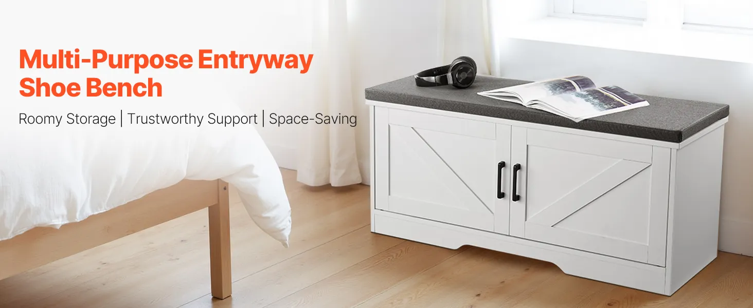 VEVOR Shoe Storage Bench, 1000 x 355 x 460 mm Shoe Organizer with Padded Seat Cushion, Entryway Bench with 2 Barn Doors and Height Adjustable Shelf, for Hallway, Living Room, Bedroom, White + Black