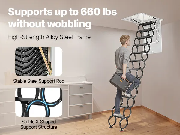 Ehitatud kõrge-tugevus legeeritud terasest, stabiilne X-raami ja terasest tugi vardad, see redel toetab kuni 660 lbs. 5,5-tolline lai samme teha ronida lihtsam, ja lisada tõmba varras võimaldab sujuv avamine ja sulgemine.