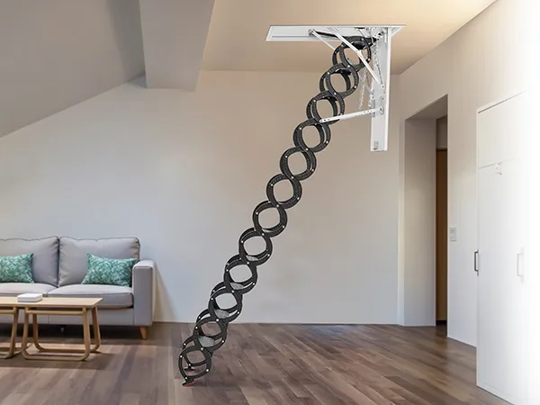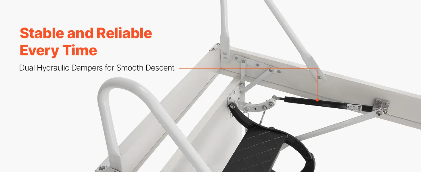 See vastupidav terasest pööningul pull-down-redeli sobib laetüüpe 10,5-11 jalga, toetab kuni 660 naela, ja funktsioonid, hüdraulilised puhvri vardad kasutamiseks meelerahu.