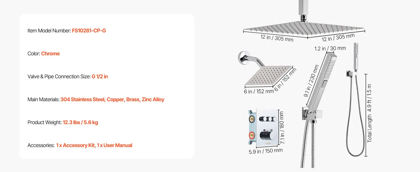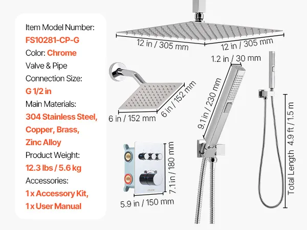 VEVOR termostaatiline vihmaduši süsteem, 305 mm laemontaaž, 152 mm seinapealne pea, 2-in-1 käsidušš, messingventiil, kroomviimistlus