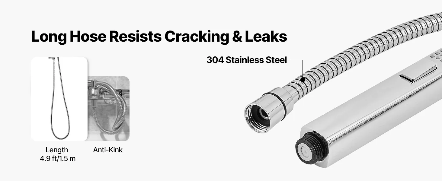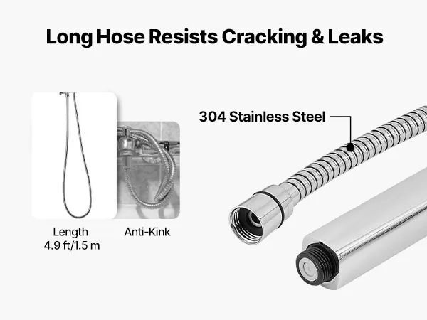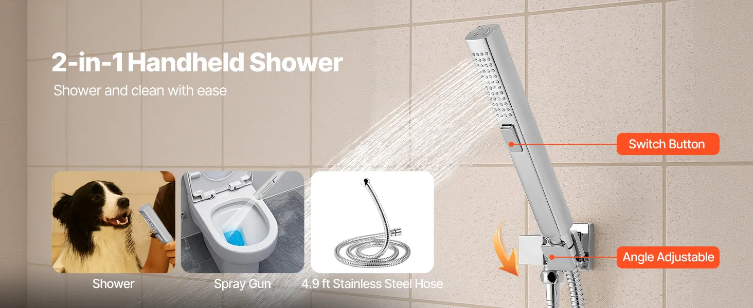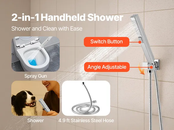 • 2-in-1 Handheld Shower: Part of our shower system, it provides shower and spray gun modes. The pressurized jet rinses walls and tubs, then auto-returns to shower mode to avoid accidents. A 4.9 ft/1.5 m hose and swivel holder ensure multi-angle cleaning