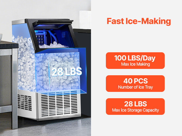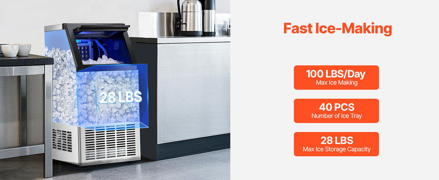 VEVOR 100lbs/24H Commercial Ice Maker, 36 Ice Cubes in 15 Minutes, Freestanding Ice Maker Machine with 28lbs Large Storage Capacity for Bar Office Restaurant, with LED Digital Display & Self-Cleaning